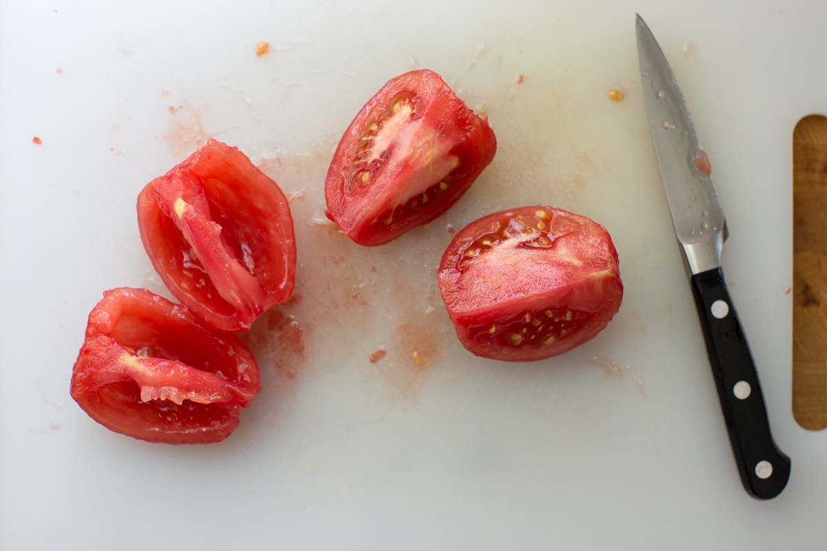 Slice your tomatoes into four wedges, and remove the seeds. Large tomatoes may be cut into eight wedges, to make this process easier.