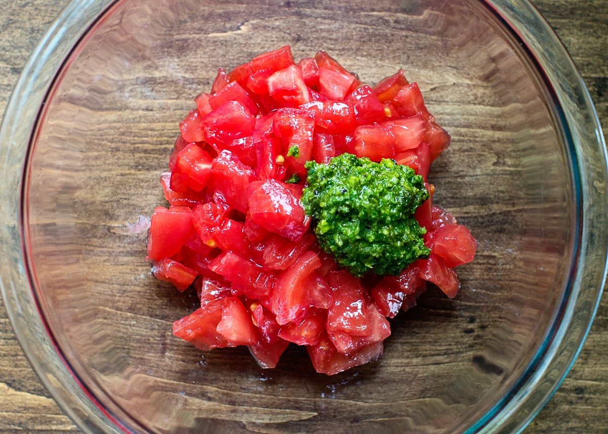 Forget chopping basil and garlic – toss in a dollop of pesto instead! Despite being almost the same ingredients, the difference in taste between pesto and chopped basil and garlic is surprising. You can also use chimichurri for this variation, which is especially delicious when served on toast points that have been topped with a thinly sliced piece of grilled beef.