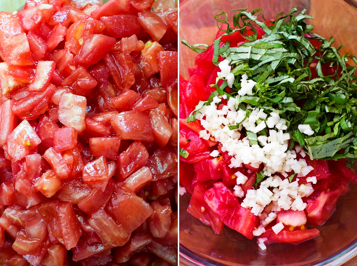Dice tomatoes into uniform pieces. For traditional bruschetta topping, toss 2 skinned and peeled tomatoes with 2 minced cloves of garlic, 1 tablespoon chopped fresh basil, 3 tablespoons of good olive oil, 1 tablespoon of good balsamic vinegar, and salt and pepper to taste.