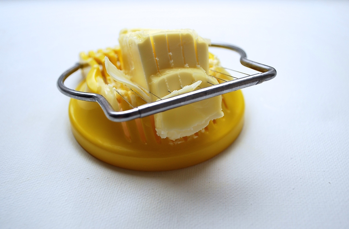 It can be difficult to prep your butter without warming it with your fingers. A neat trick to help with this is to use an egg slicer. I have an inexpensive plastic version that slices through very cold butter easily. It cubes the butter into tiny pieces and protects it from the heat of my fingers.