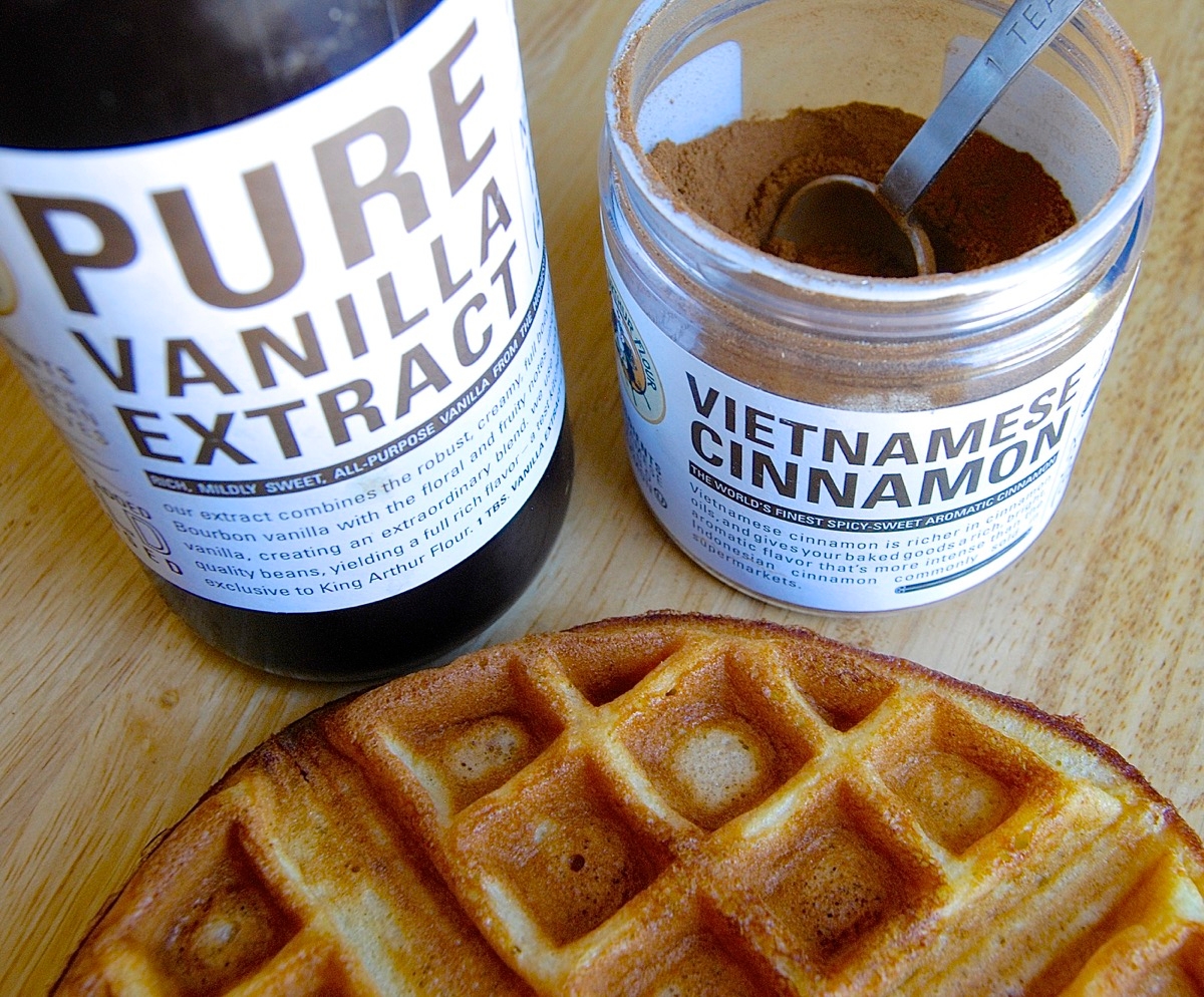 How much should you add? For a typical waffle recipe, I'd add 1 teaspoon vanilla, or 1/2 teaspoon cinnamon, or 1/4 teaspoon nutmeg. Want to add all three? Go right ahead! Allspice and ginger give waffles a winter holiday flavor, while lemon oil or extract is perfect for summer – especially if you'll be topping the waffles with fruit.