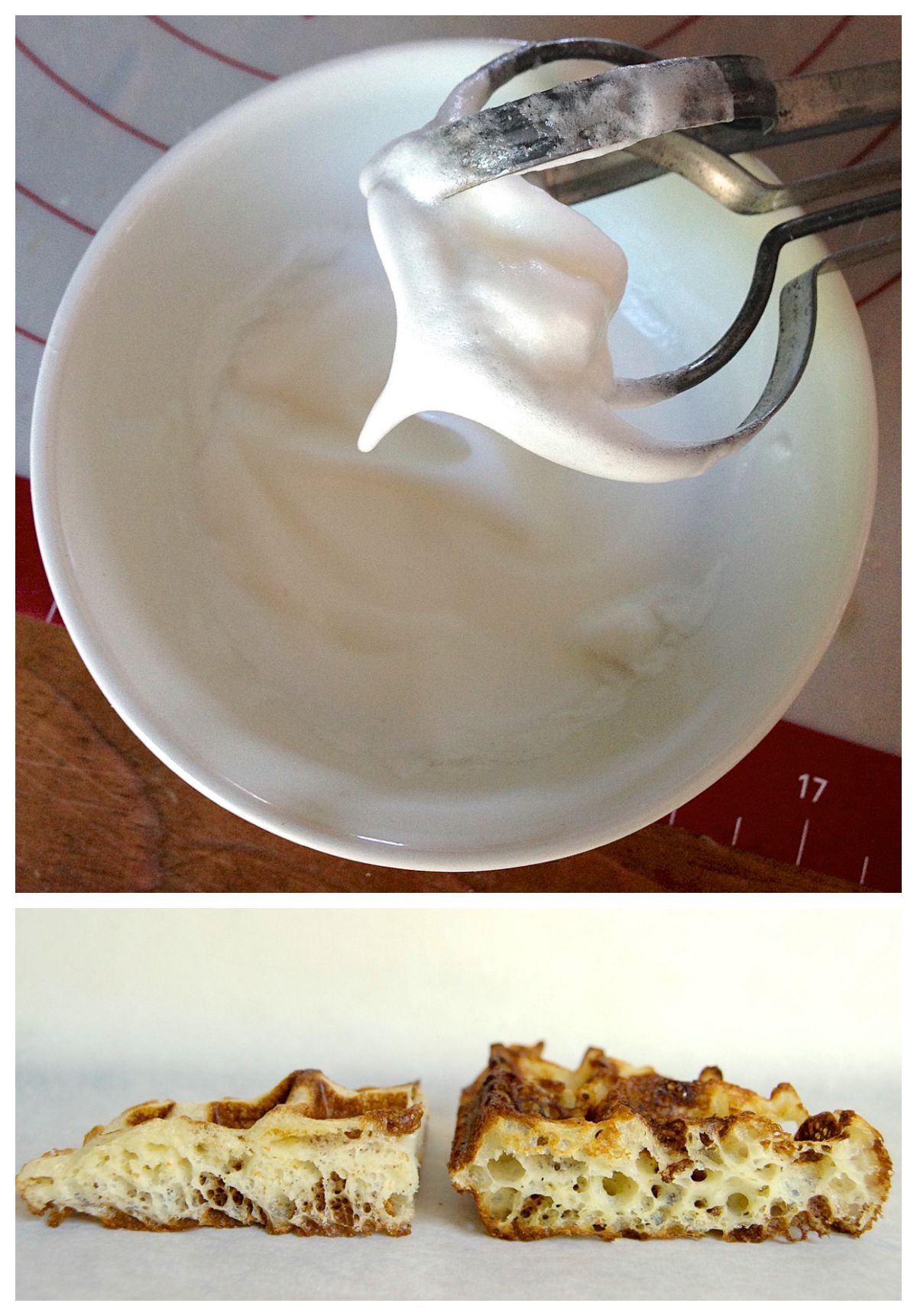 As it turns out, no. Above, at left, is a waffle made without whipped egg whites. On the right, one made with whipped whites. The difference is fairly subtle, looks-wise, but when you eat them side by side, waffles made with whipped whites are noticeably lighter.