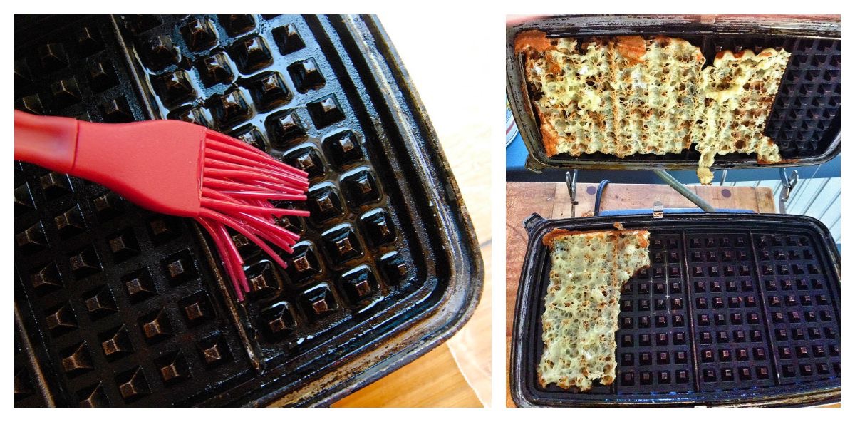 Rick swears the best bet is to brush the iron with melted butter; I prefer vegetable oil. Either way, we find that a simple spritz with a can of non-stick vegetable oil spray doesn't do it. When using an older iron, take the time to use a pastry brush to paint all the nooks and crannies with the fat of your choice.