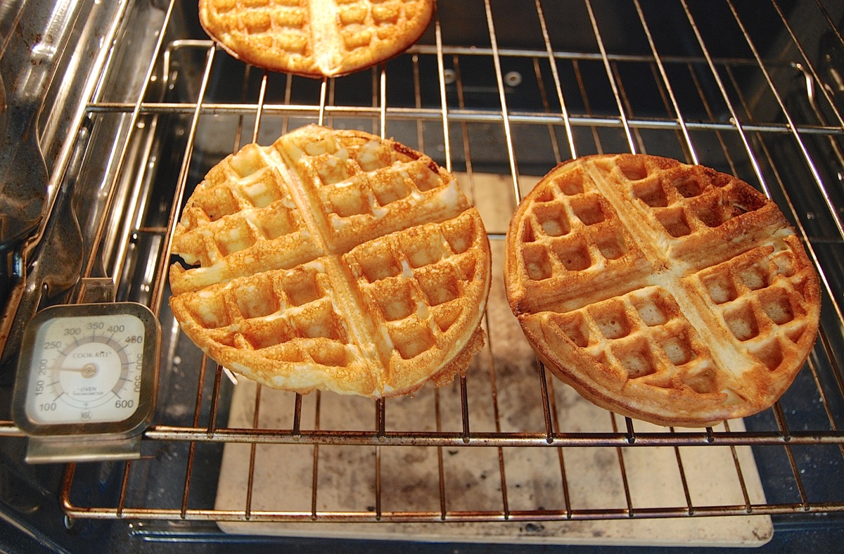 You're not baking just a single waffle, right? Most recipes make 5 to 7 waffles. Unless you're going to sit down and eat the first one, then make the rest later, keep the finished waffles warm and crisp in a 200°F oven. Placing them right on your oven's rack will prevent sogginess.