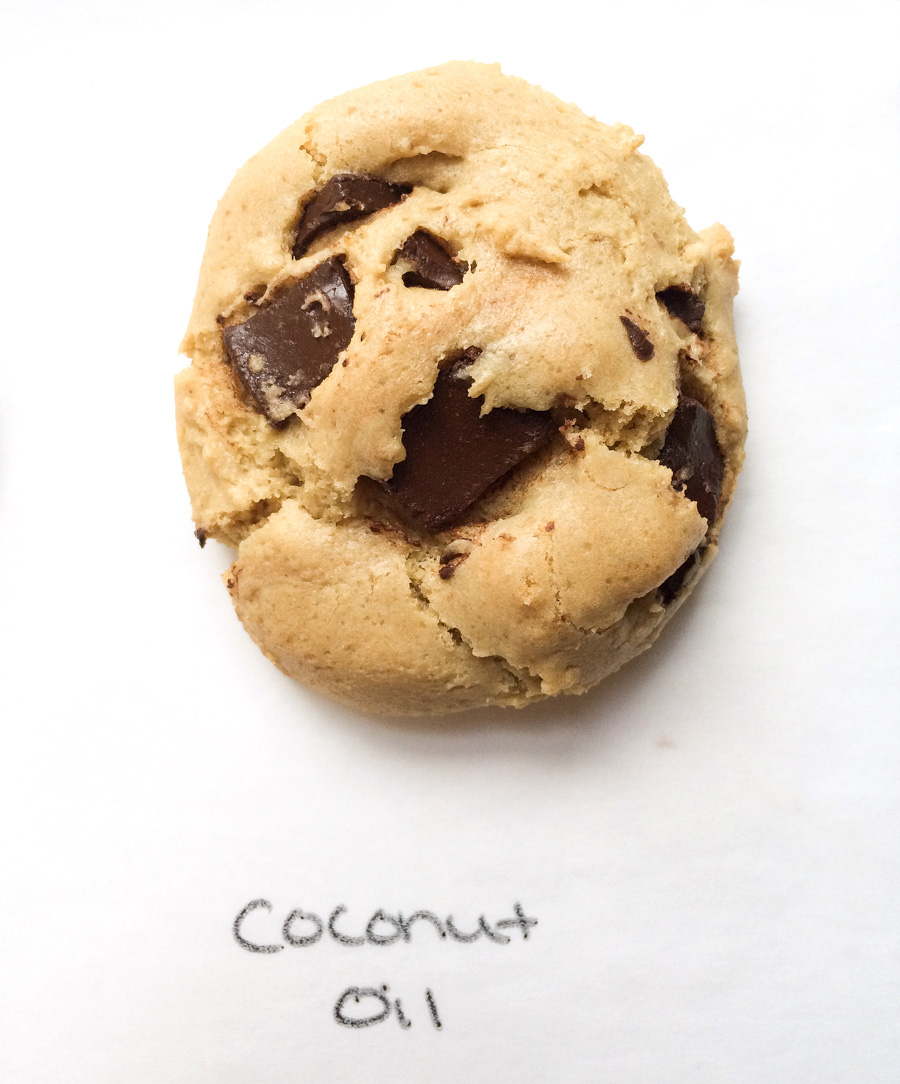The coconut oil chocolate chip cookies showed a marked difference from the original recipe, and were our least favorite. Since we used all coconut oil in the recipe, there was an underlying coconut flavor to the cookies.