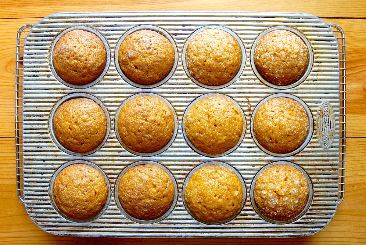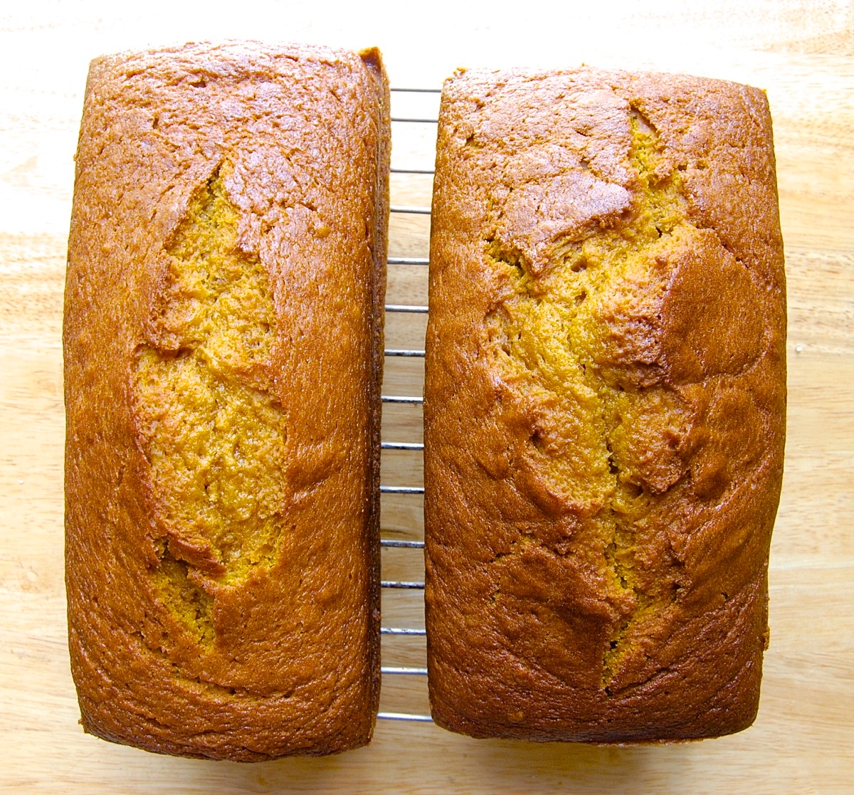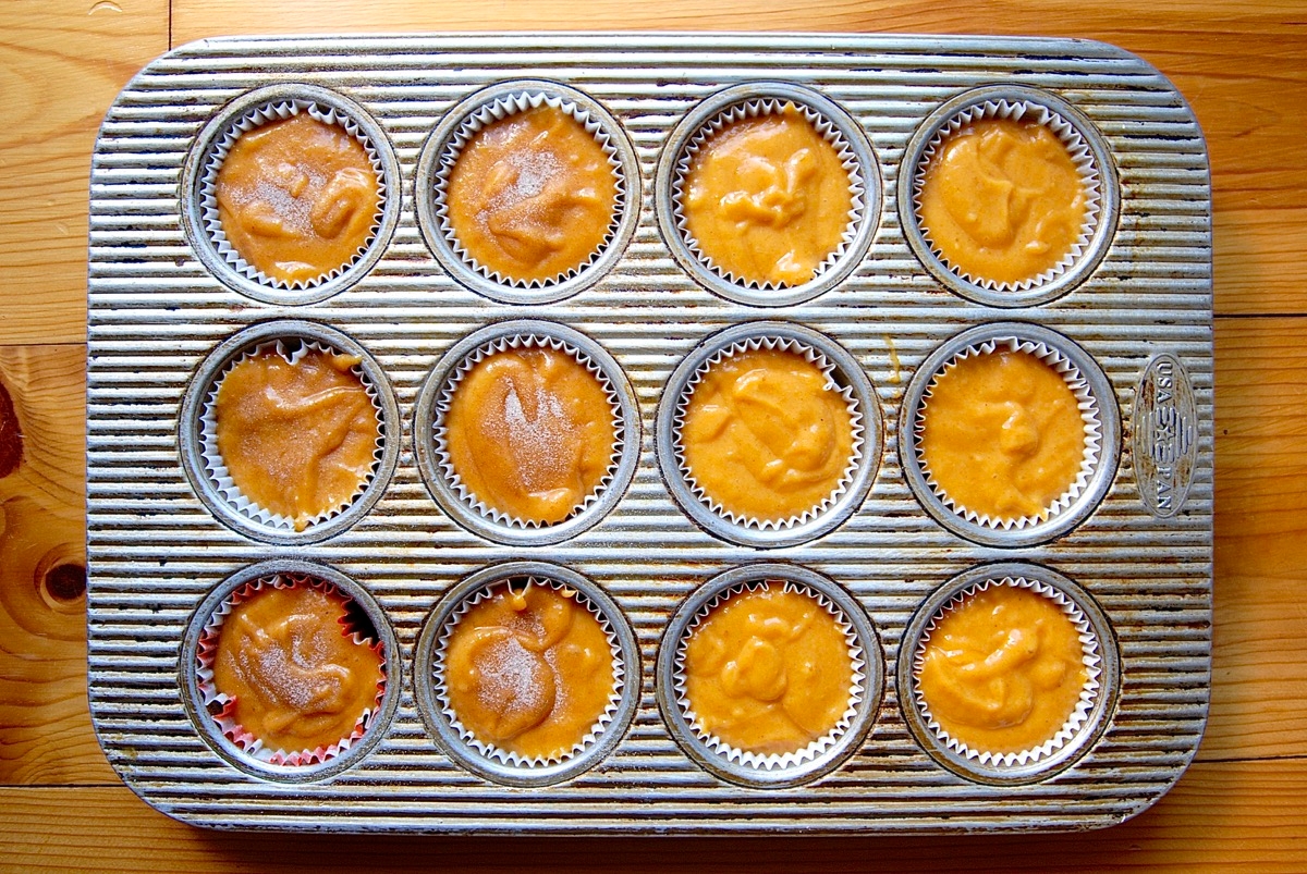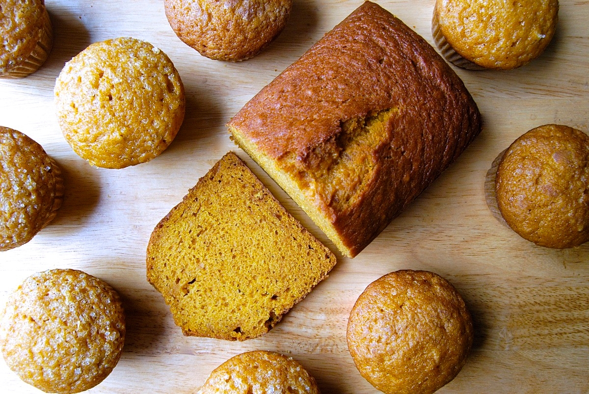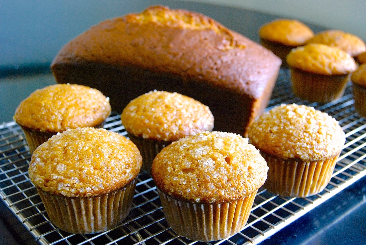 Our Easy Pumpkin Bread recipe yields two loaves. Let's see what happens when I divide the batter in half, and make one loaf and a dozen muffins.