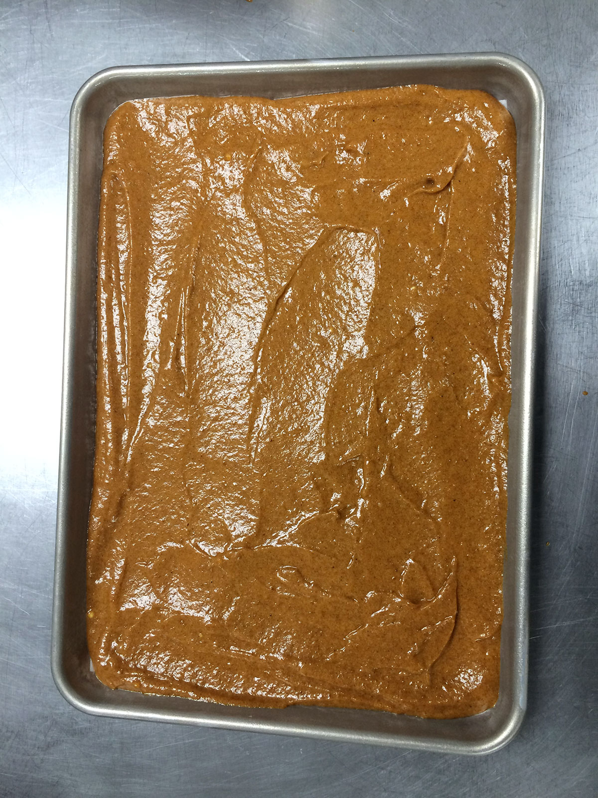 Pour the batter into the prepared pan and spread it evenly. Bake the cake for 14 to 16 minutes, until the top springs back when lightly touched. Remove the cake from the oven, and allow it to cool in the pan for 2 minutes.