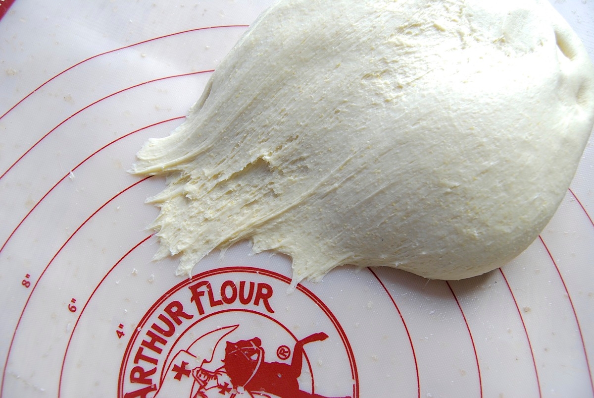 Notice the dough is smooth and elastic, but still has a tiny bit of stickiness. This is the texture you're after.