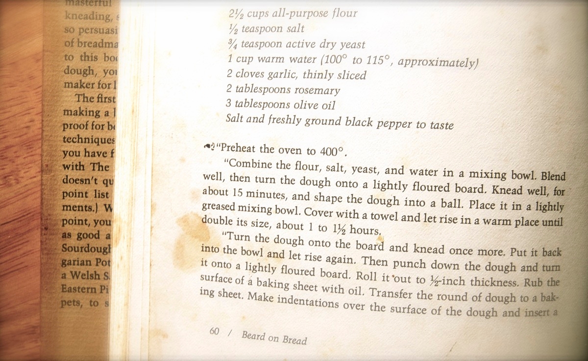I make this recipe for basic focaccia again and again and again, as the stains on the page testify.