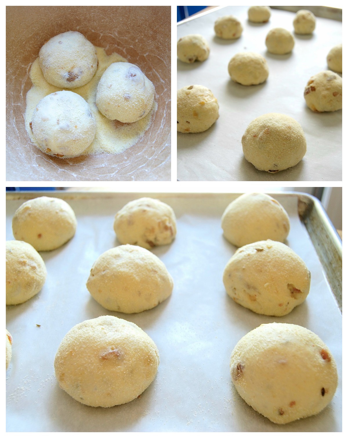 Divide the dough into 24 pieces, and round each piece into a ball. Drop the balls into a shallow pan with some semolina (or yellow cornmeal), and roll them around to coat.