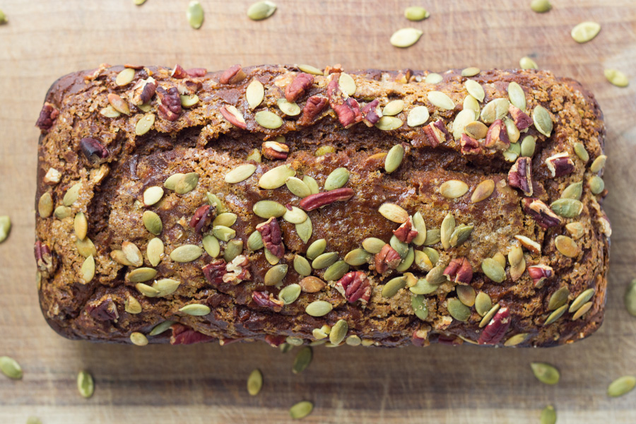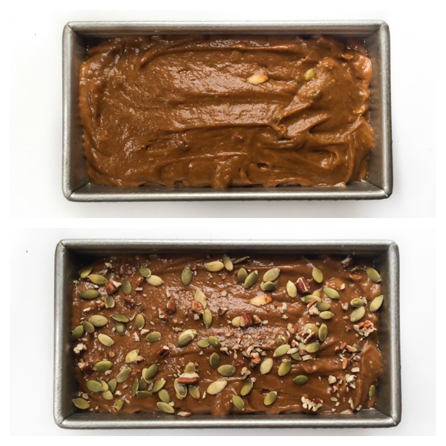 Scoop the batter into the prepared loaf pan and sprinkle with any additional toppings you'd like — I went for a few more chopped pecans and pumpkin seeds, plus a touch of sparkling sugar.