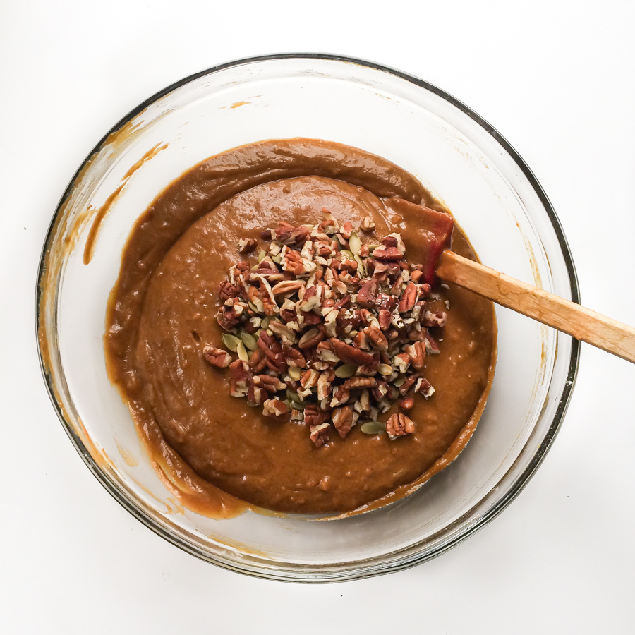 Fold in your add-ins — I used 1/2 cup of chopped pecans and 1/2 cup of raw pumpkin seeds.
