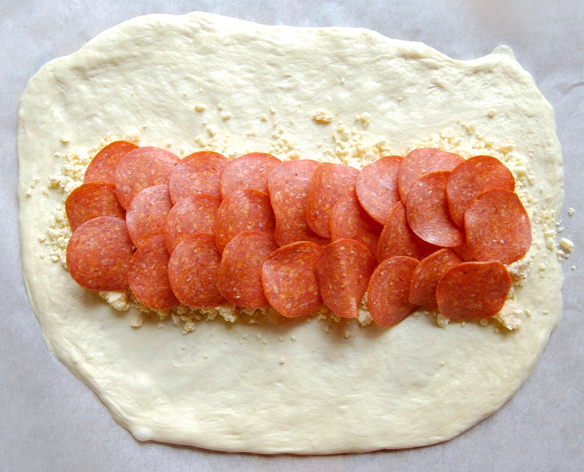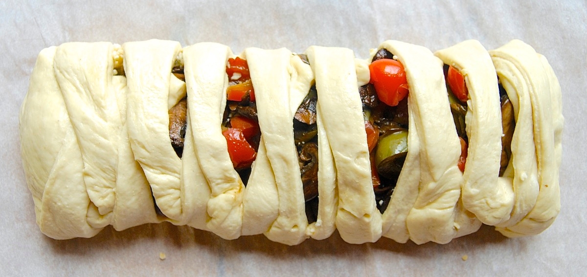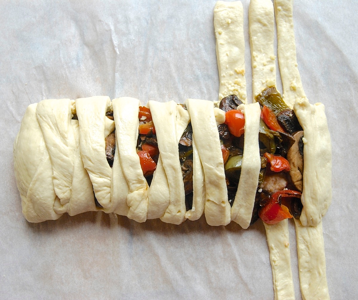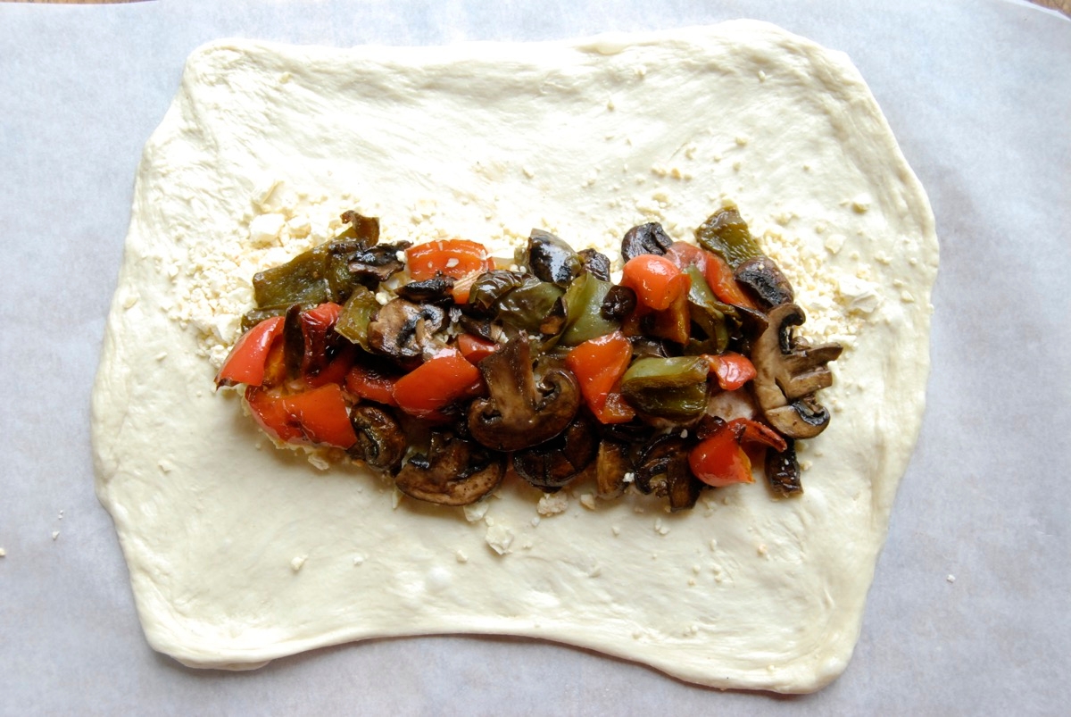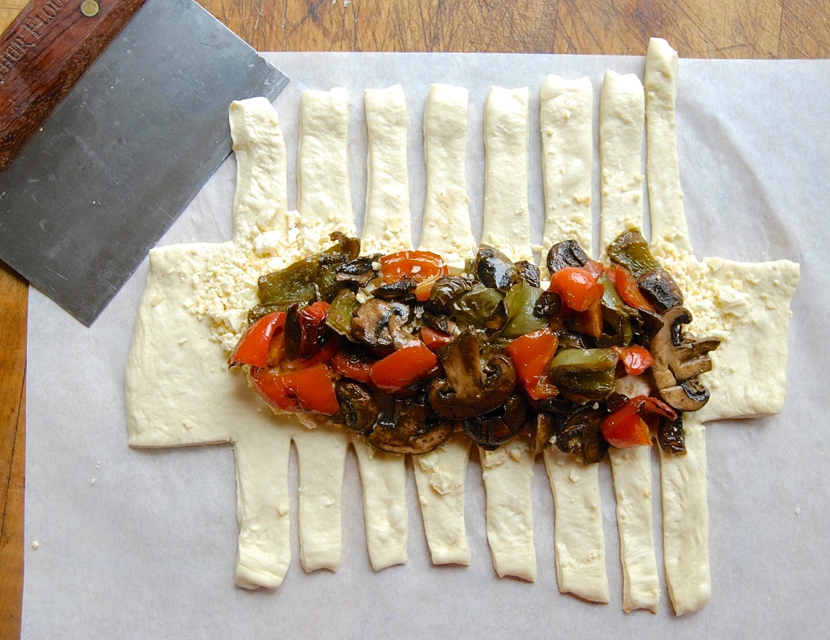 Layer your toppings (fillings) down the center third of the dough, lengthwise. I usually put the cheese down first, in order to showcase the more colorful toppings, which end up peeking through the top crust.