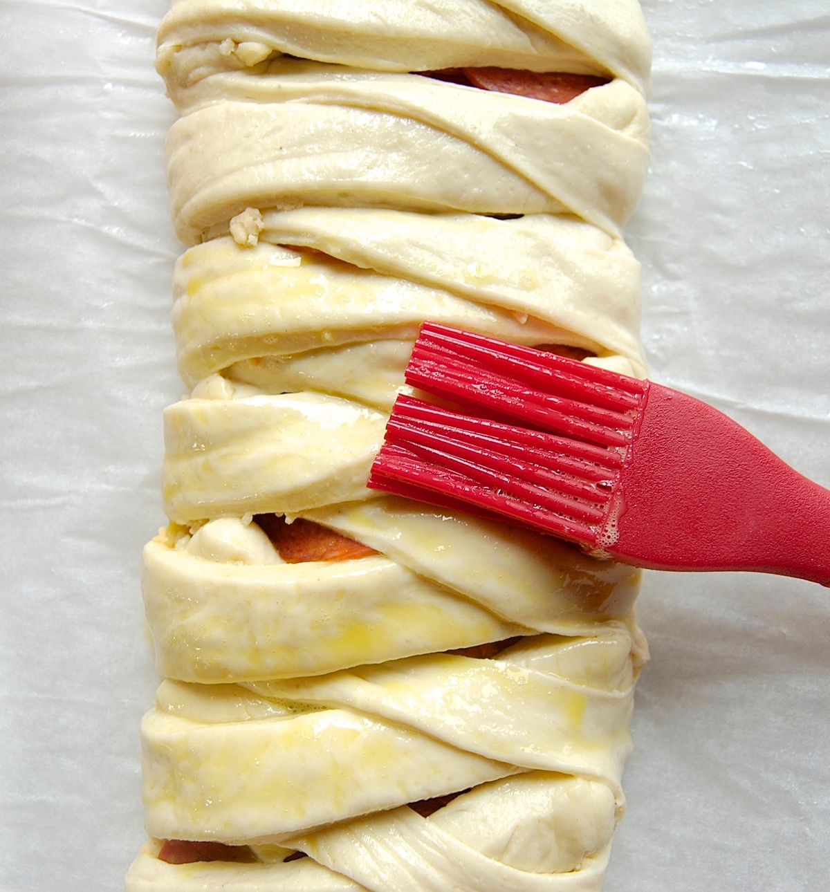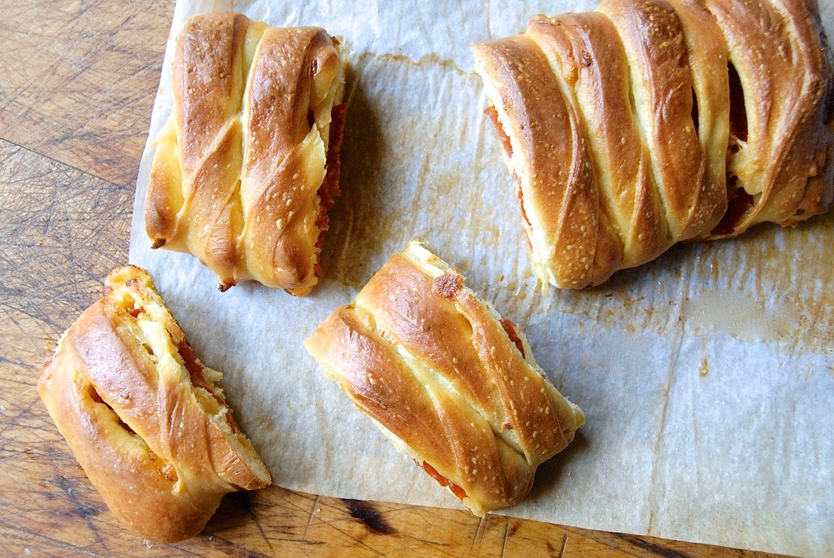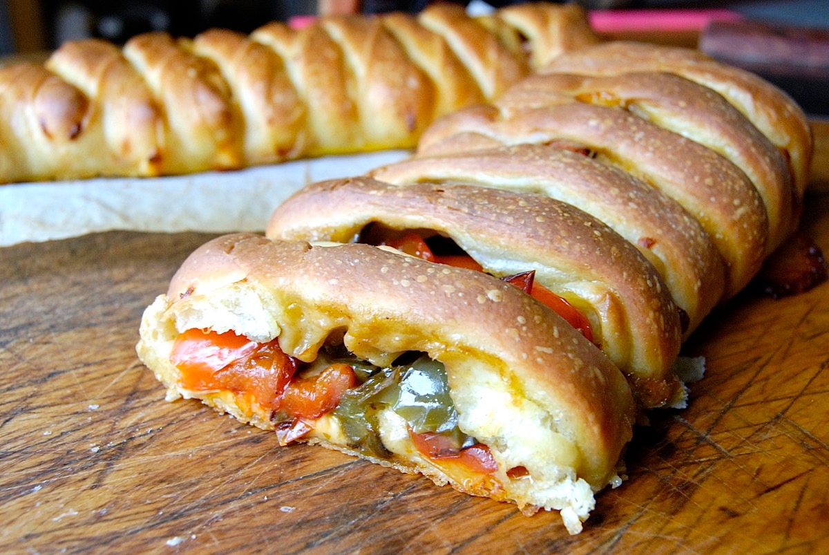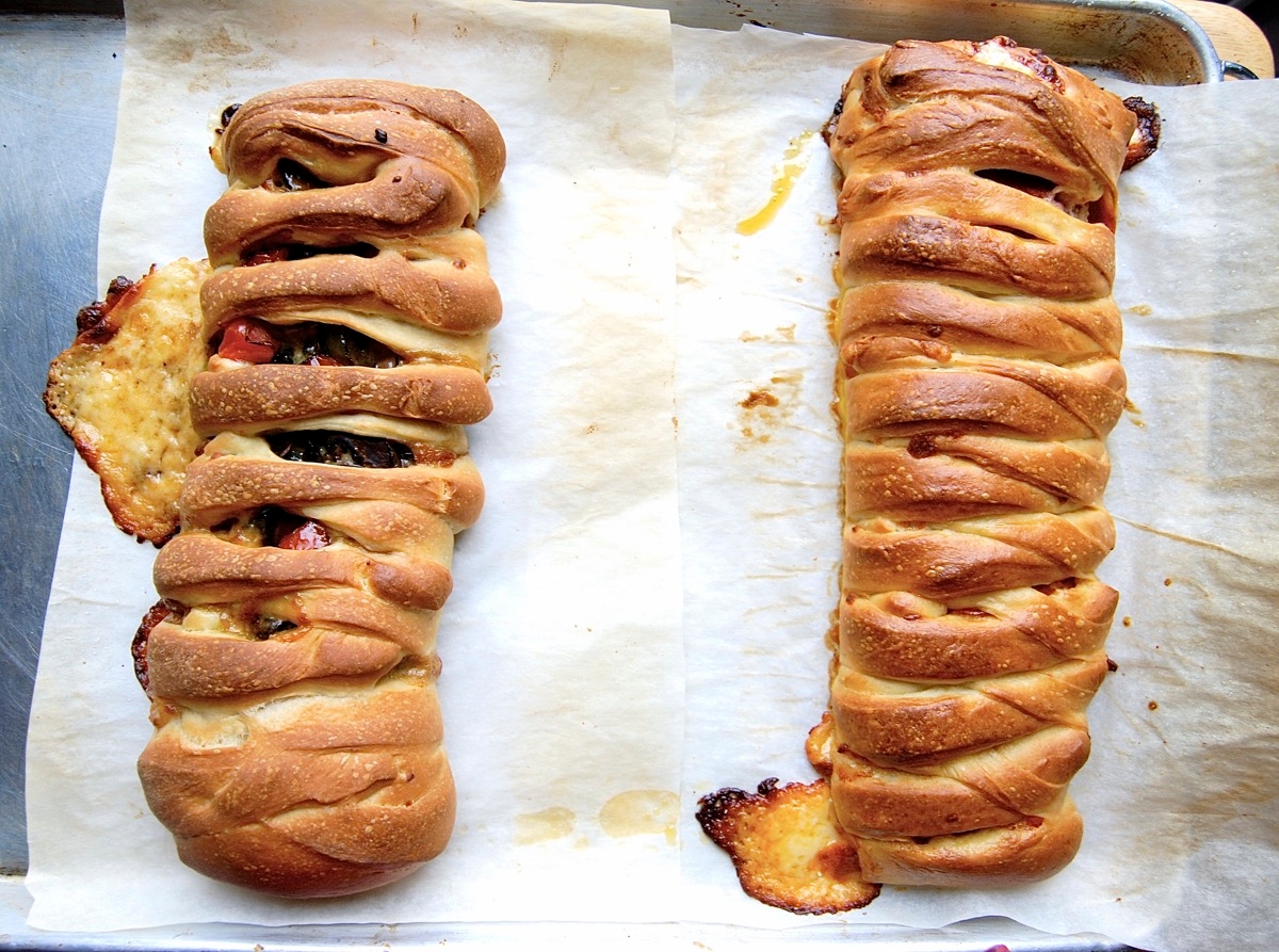Layer your toppings (fillings) down the center third of the dough, lengthwise. I usually put the cheese down first, in order to showcase the more colorful toppings, which end up peeking through the top crust.