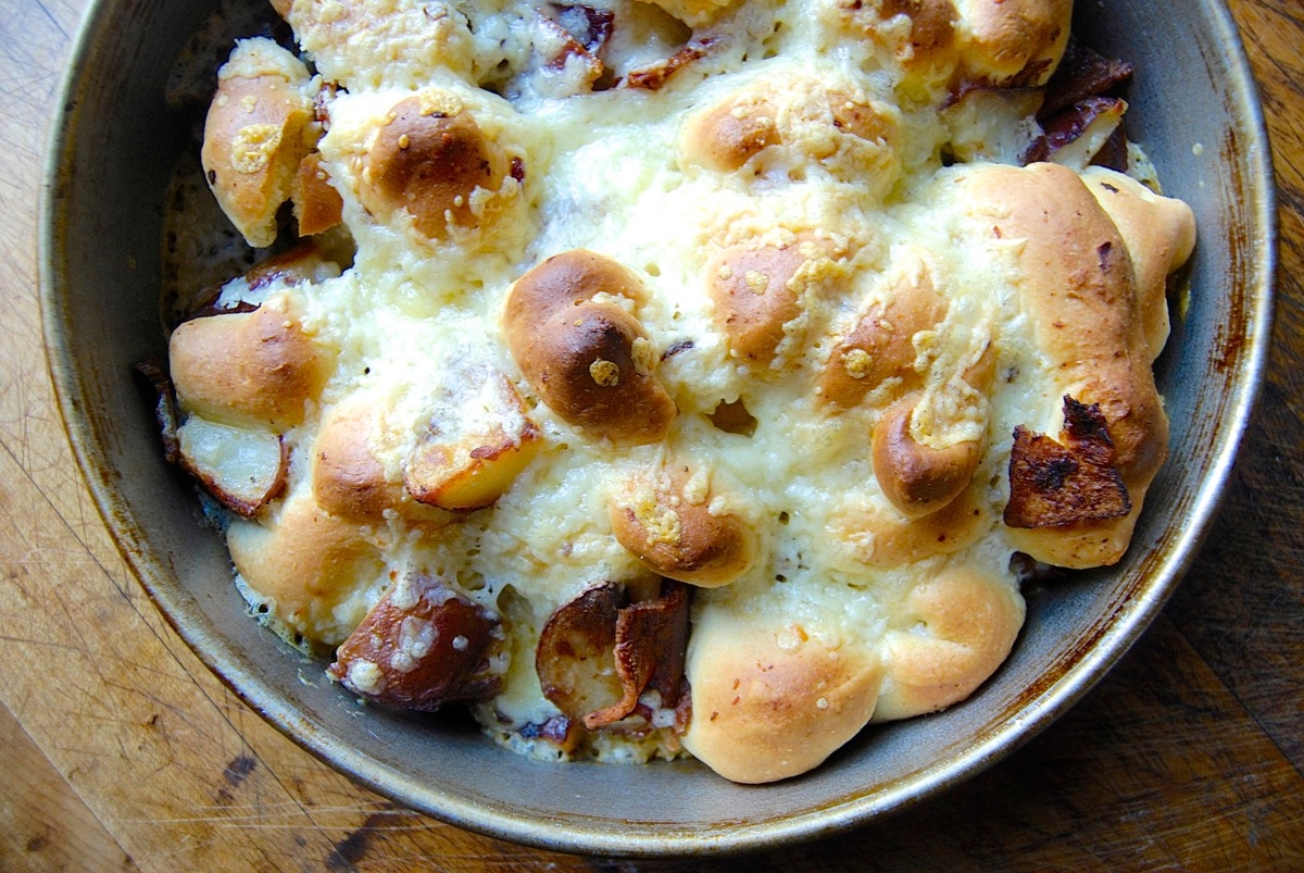 Each piece is filled with crusty potatoes, pockets of melted cheese, and crunchy bacon. To say nothing of light, tender bites of flavorful crust.