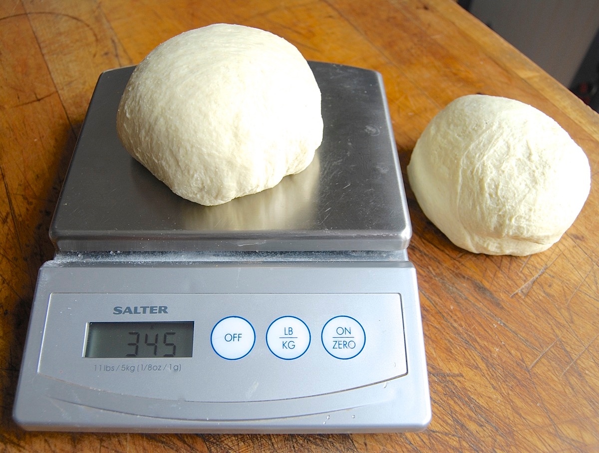 But this time I divide the dough in half, since I'm making two smaller pizzas: one using a traditional "chop bread" method and classic pizza toppings (pepperoni and cheese); the other using a "mix and toss" method, and featuring more substantial toppings: oven-roasted potatoes, thick-cut bacon, and chunks of cheddar cheese.