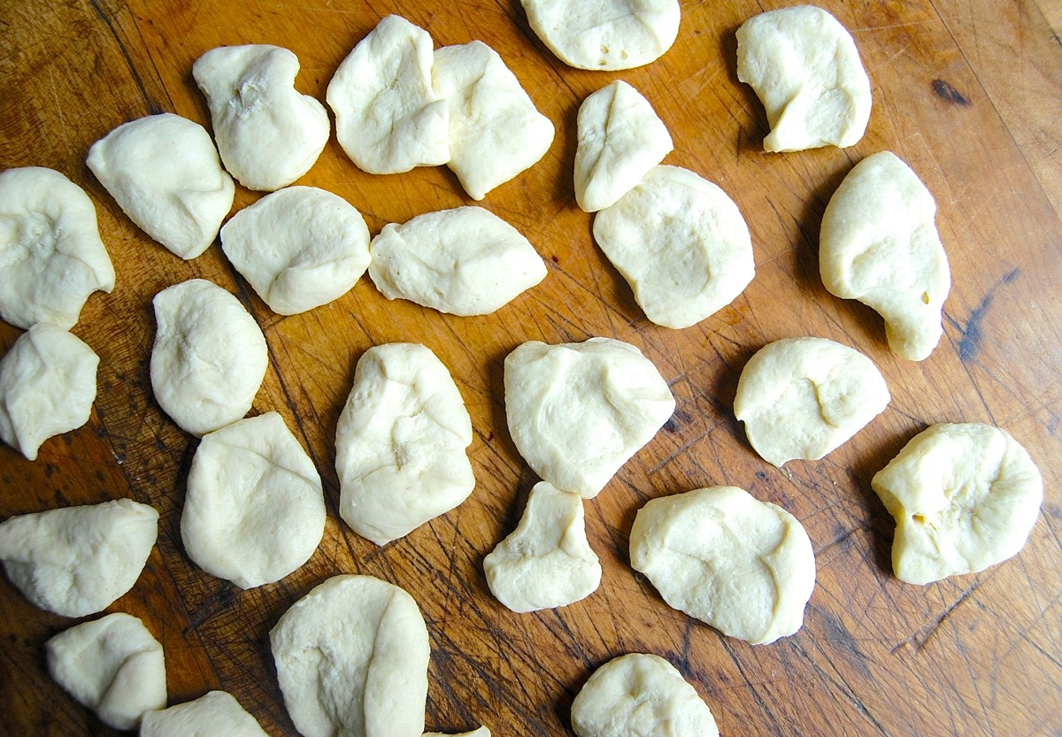 Dice the cheese, dice the bacon, and toss everything together with the dough pieces (bottom right).