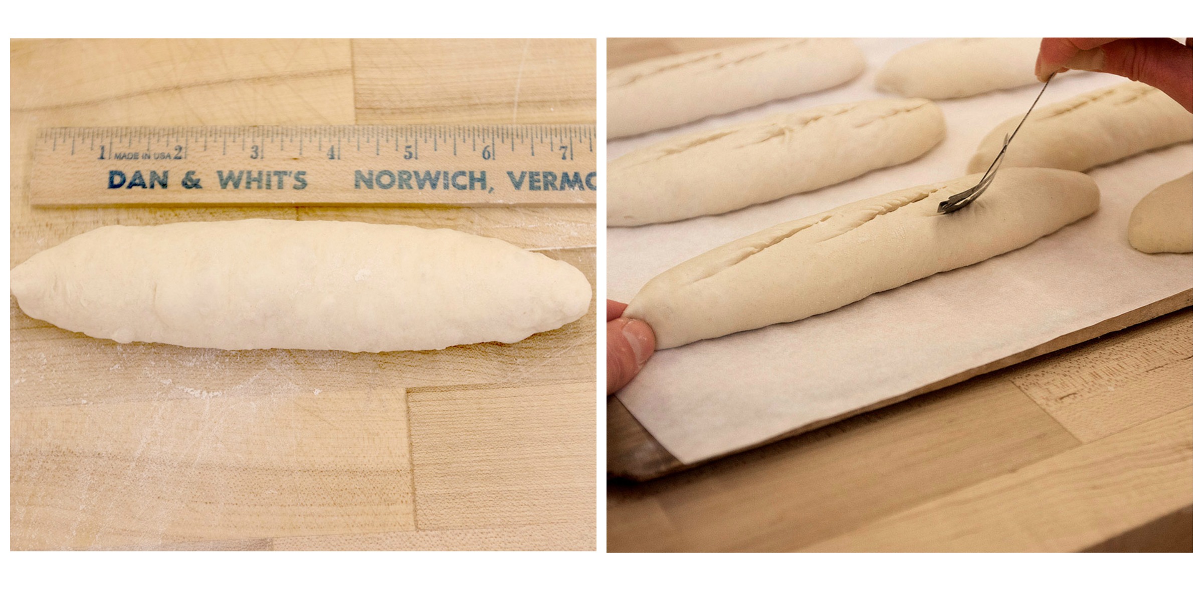 Using a very sharp knife or lame held at about a 45° angle, make three to four 8" vertical slashes in each baguette. Our video on how to slash a baguette walks you through it.