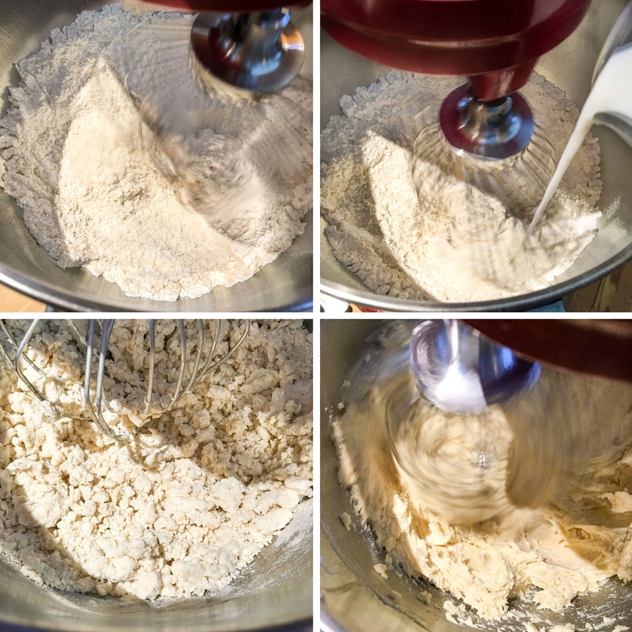 Mix until combined, then with your mixer running on low, slowly pour in 1 cup (227g) of warm milk. The mixture will be crumbly at first, but once all the milk is added, it'll come together.