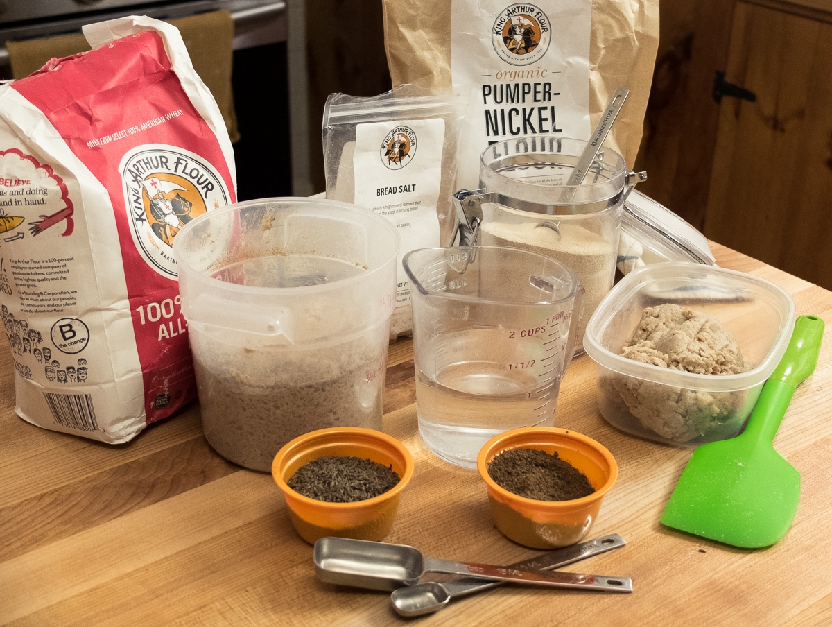 Yesterday we prepared the rye sour, old bread soaker, and ground caraway seeds for our Jewish Rye Bread recipe; see How to Make Jewish Rye Bread, Part 1 for details. Today we’re ready to mix and bake our bread!