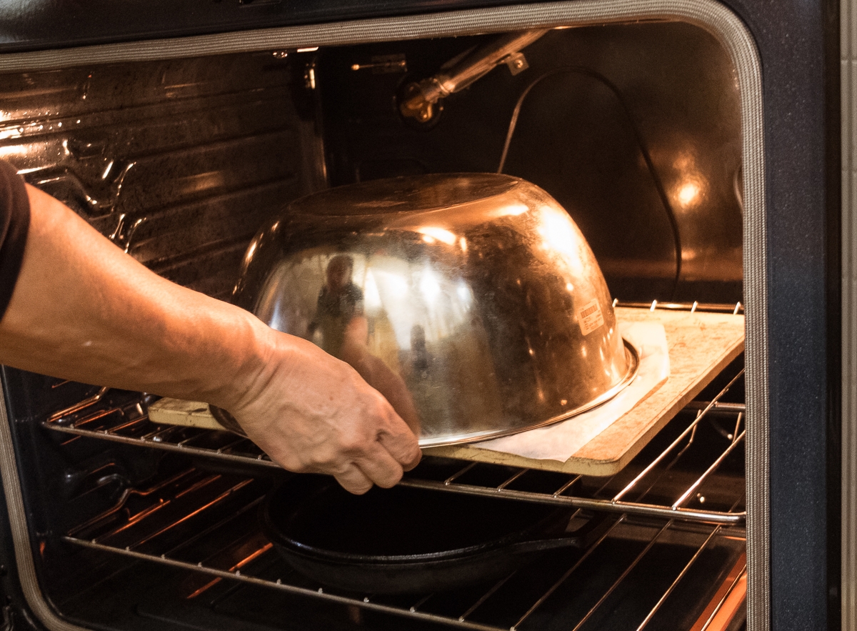 Don’t have a stone? You can use the same method, but place the bowl over your baking sheet. A bowl helps contain the steam during the initial period of oven spring and will give you the best results; but you can also simply pour the boiling water into the cast iron frying pan, without covering the loaf.