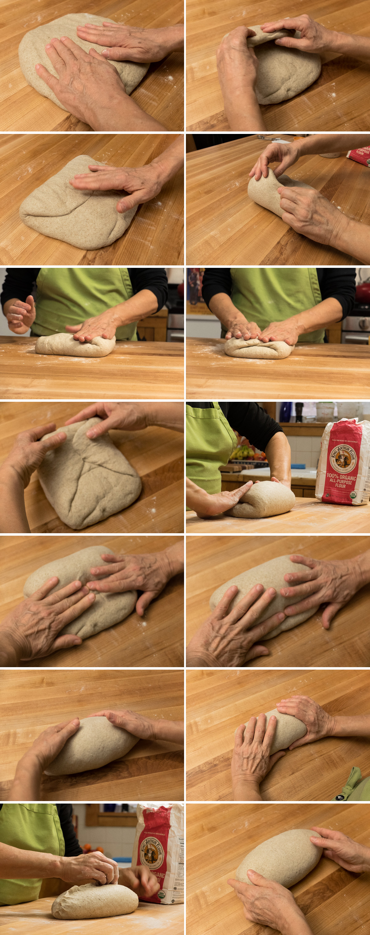 Notice the pinching going on in the bottom left photo? This is only necessary if the bottom of your loaf hasn't sealed properly.