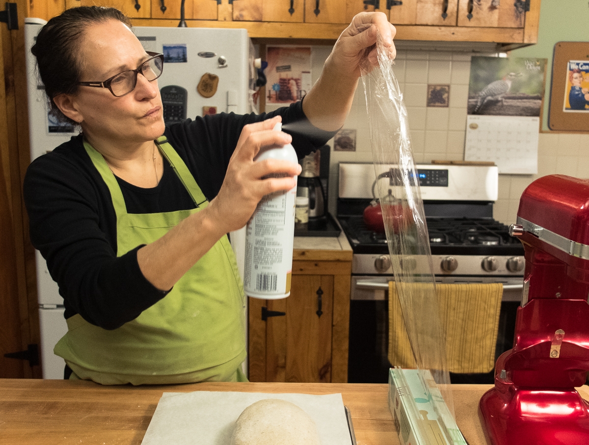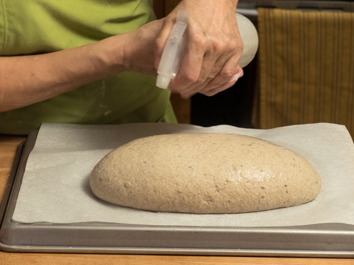 Cover the loaf with sprayed plastic and place in a warm spot (78°F) to rise.