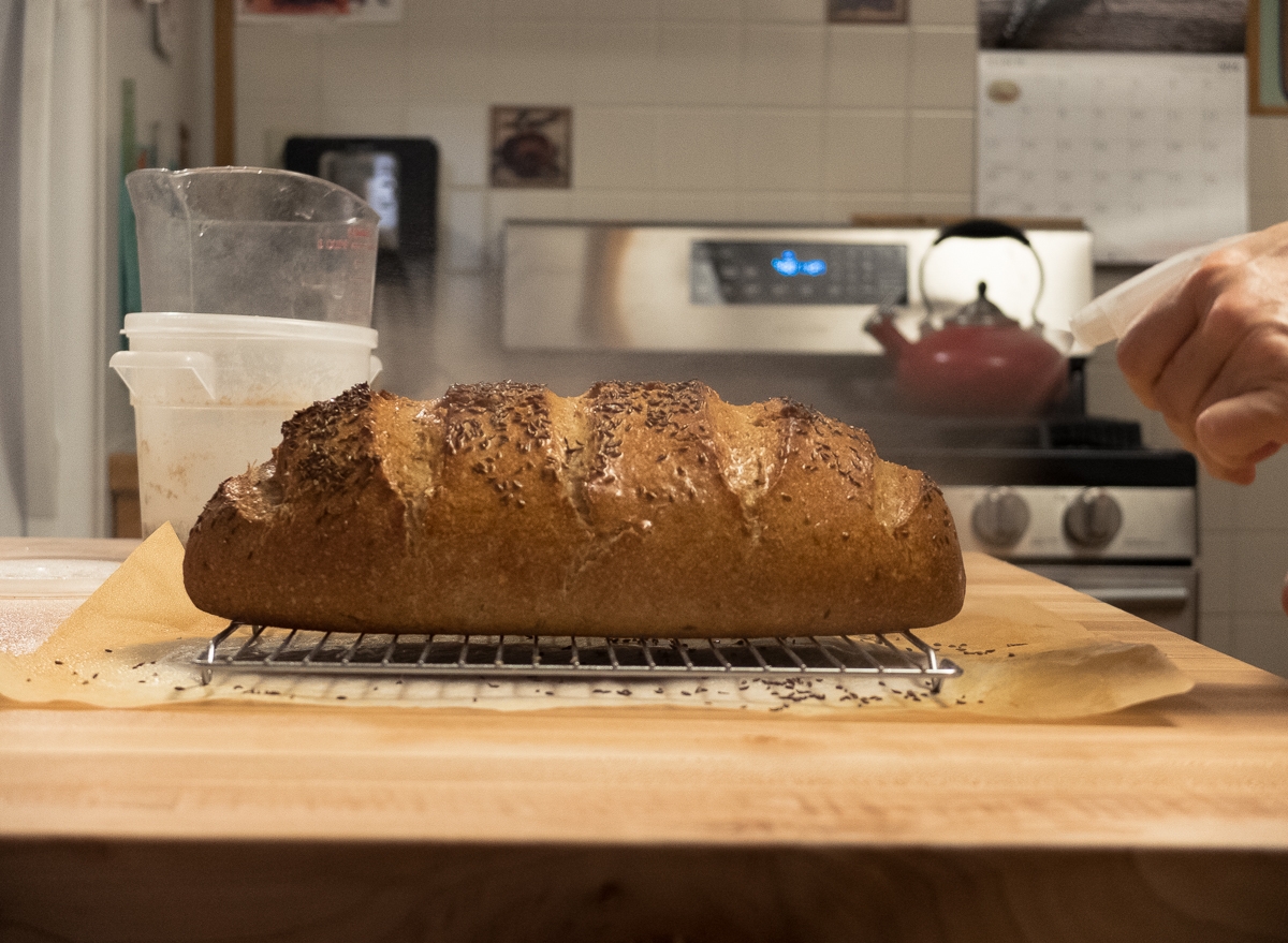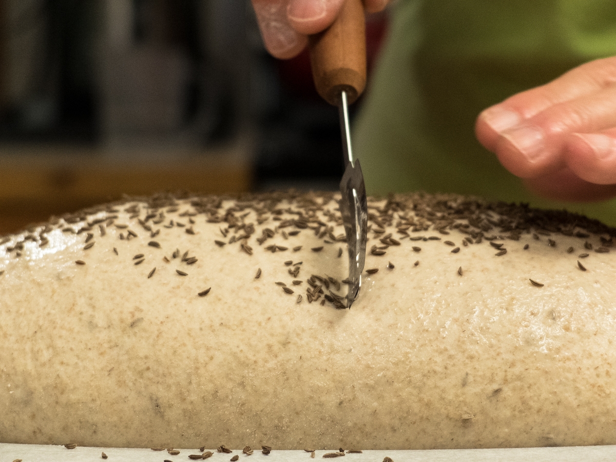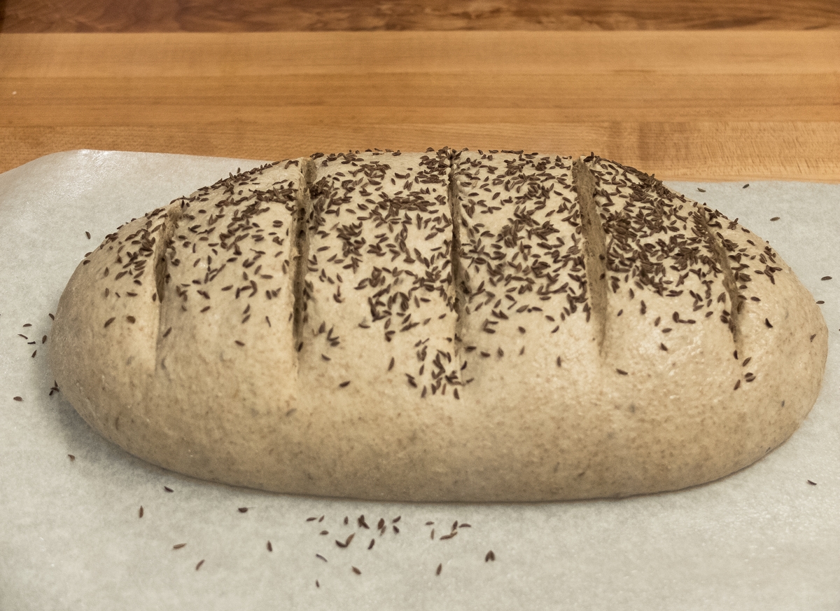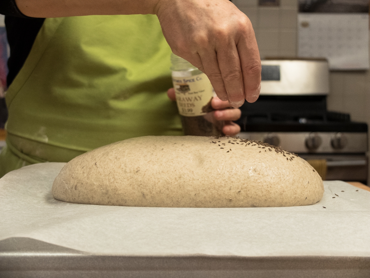 Next, spray the surface of the loaf with water and sprinkle with additional caraway seeds, if desired.