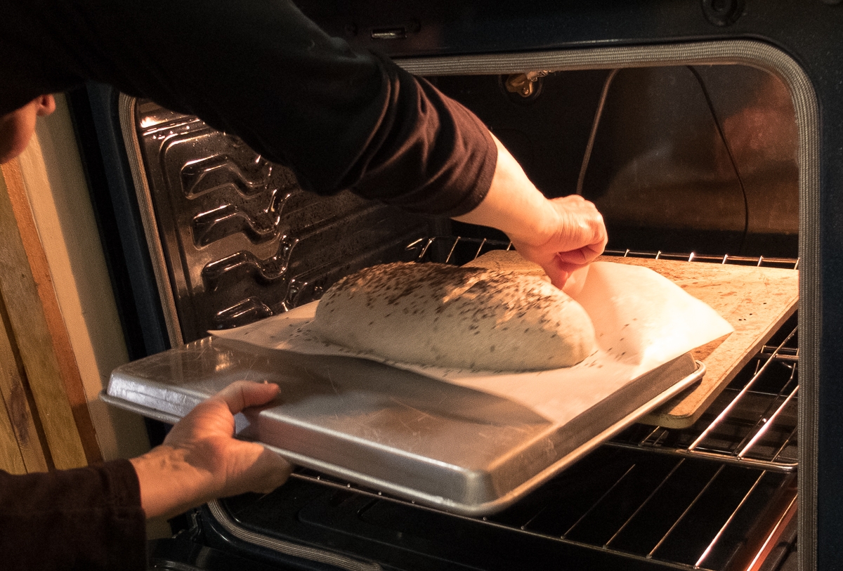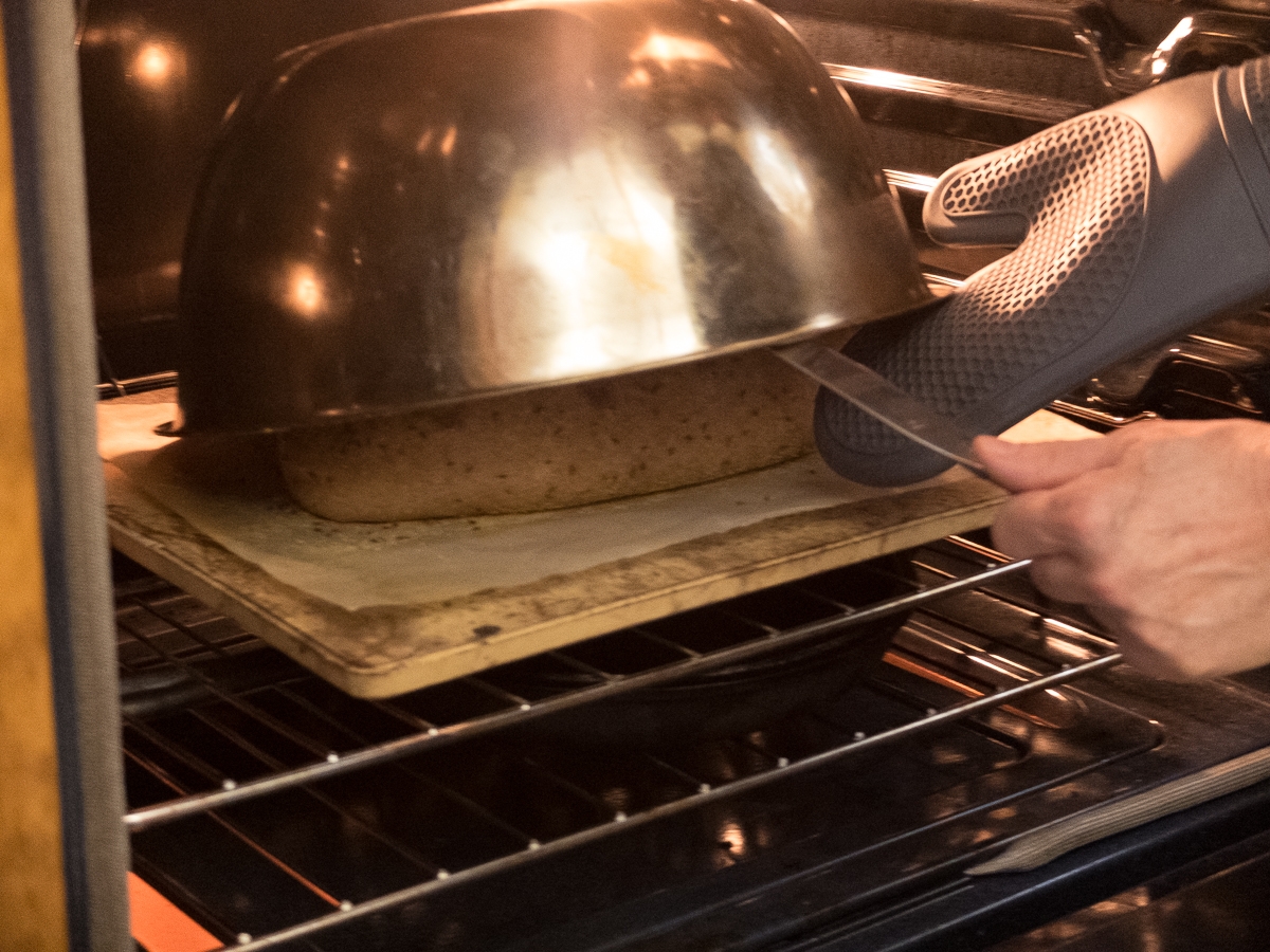 Load the loaf onto the stone by carefully sliding the parchment paper and loaf onto the stone.