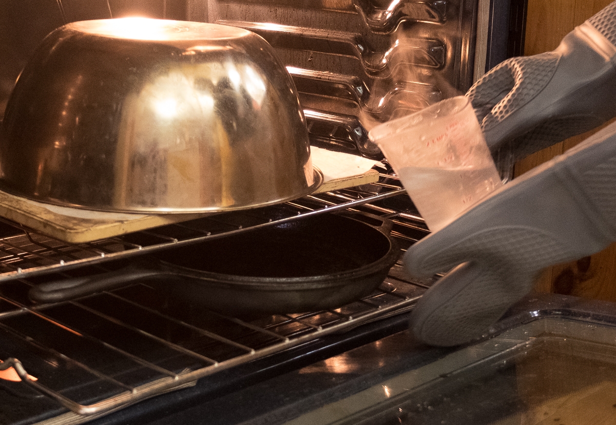Pour 1/2 cup boiling water into the cast iron frying pan and slide the shelf in so that the steam vents directly into the bowl above it. Be sure to wear good oven mitts throughout this process to avoid a steam burn!