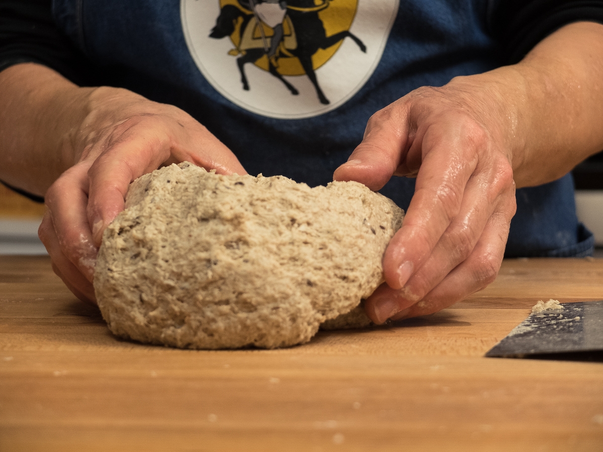 Since the pentosans in rye flour are likely to break down with heavy kneading, we're not going to go wild kneading for a long time.
