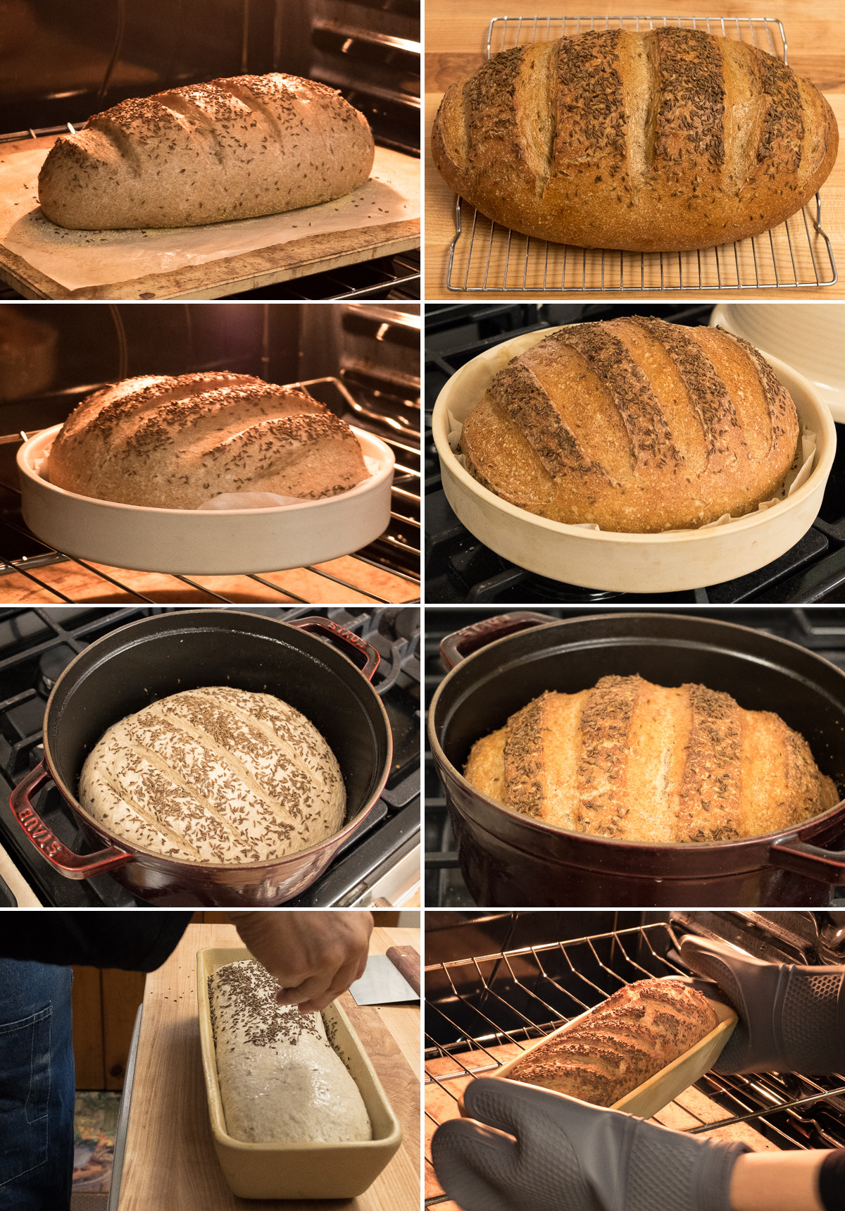 Here are our beautiful rye loaves, baked four different ways. The top loaf was baked on a stone with a bowl and steam. The second loaf was baked in our Cloche Bread Baker. The third loaf was baked in our Staub 4-quart Dutch Oven. And the lovely loaf on the bottom was baked in our Long Covered Baker.