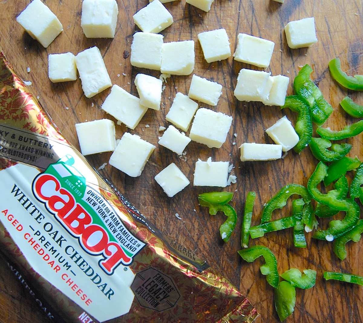 I'm using 4 ounces diced cheddar cheese, and one small (3") jalapeño pepper, seeded and sliced.