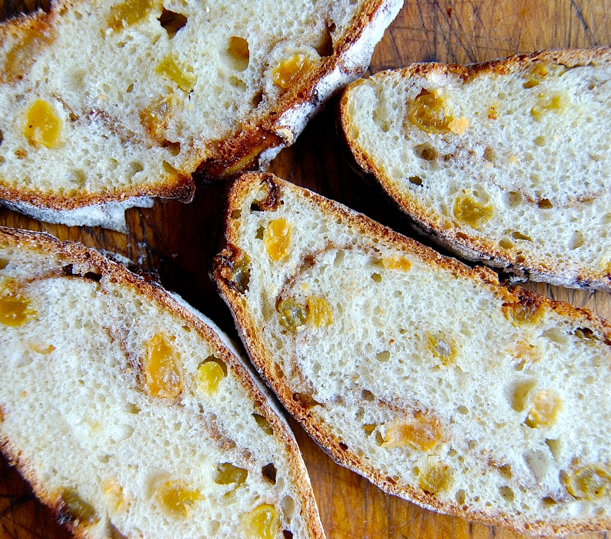Here's a loaf with mixed (pitted) Greek-style olives and feta cheese – about 1 1/2 cups total, your choice as to the amount of each. Kalamata or oil-cured black olives are both good; don't use anything too juicy.