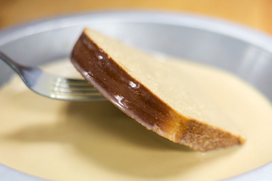 Dip each side of bread briefly in the batter. You want to moisten it evenly, but not soak it to sogginess.