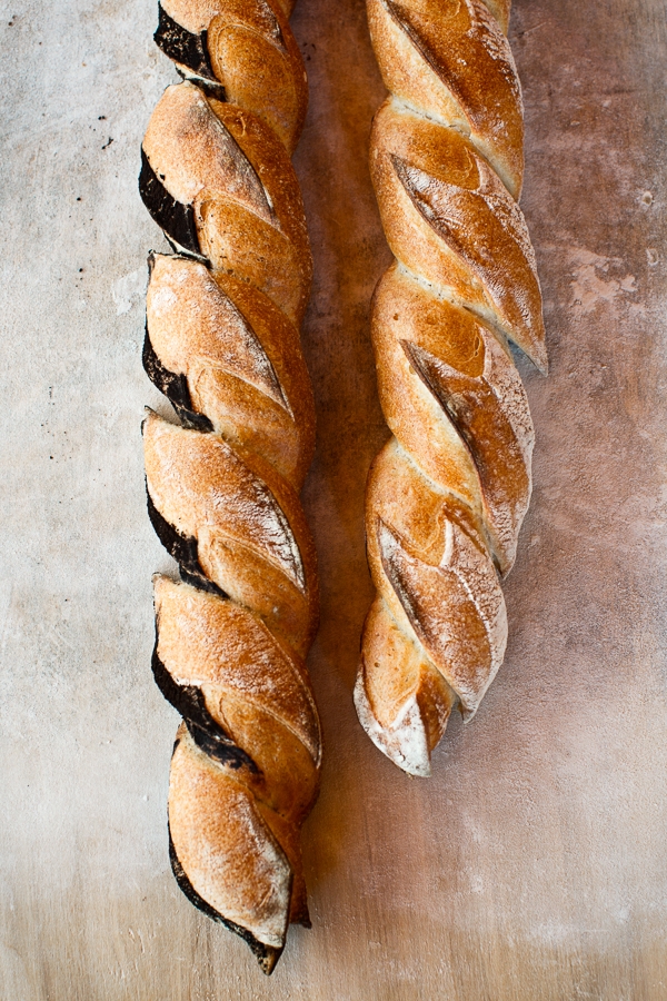 Decorative baguettes, dusted with cocoa powder (left) and flour (right)