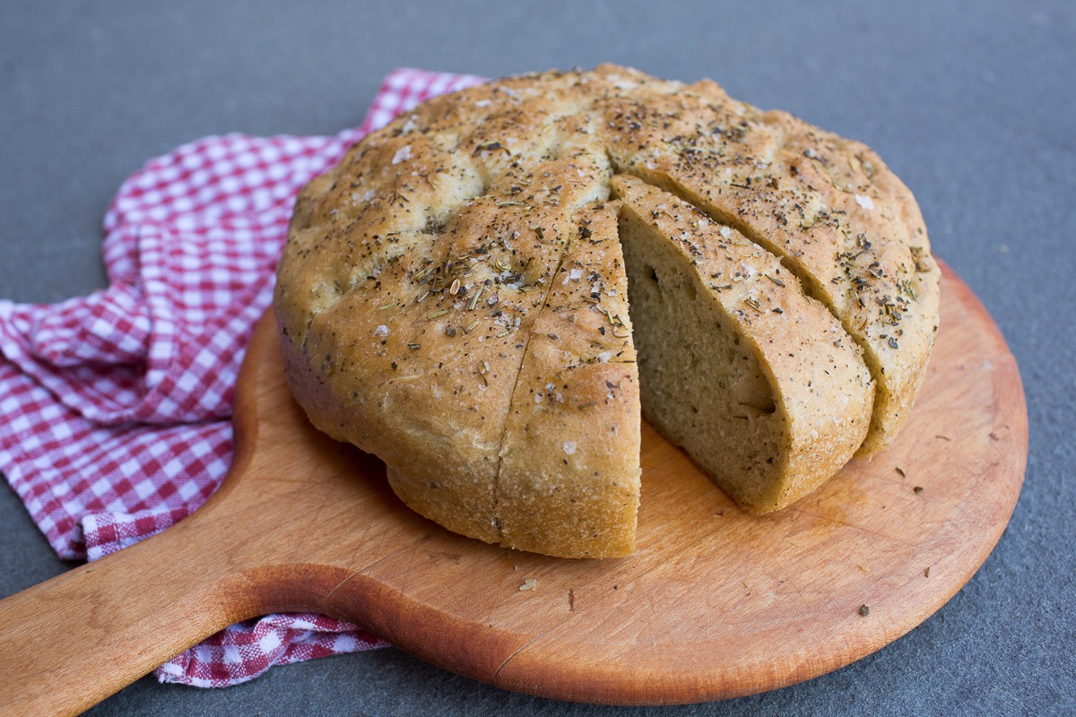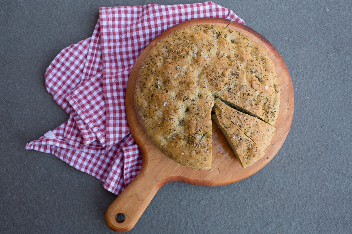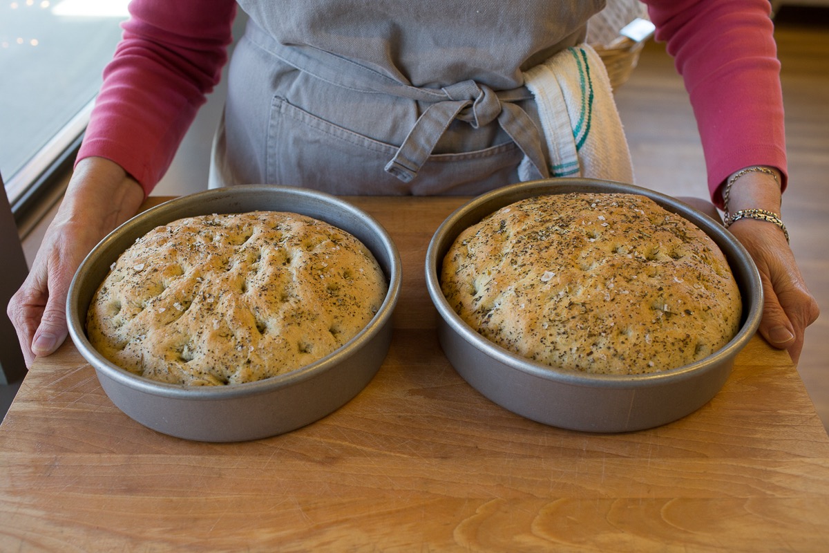 Remove the focaccia from the oven, and turn it out of the pans onto a rack to cool just slightly before serving.