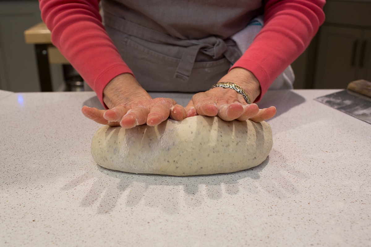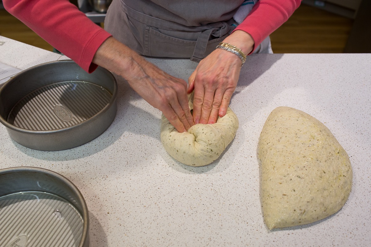 Gently deflate/de-gas the dough by pressing lightly; no need to punch it, says Gael. Turn it out onto a lightly floured counter; it should feel like a big marshmallow, very pliable.