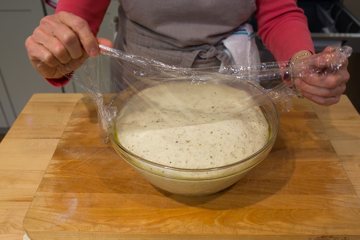 Place the dough in a lightly oiled bowl and turn the dough on all sides to coat with oil. Cover it loosely with plastic wrap.