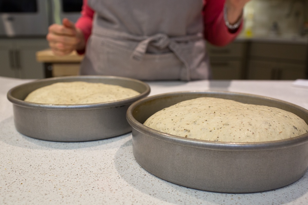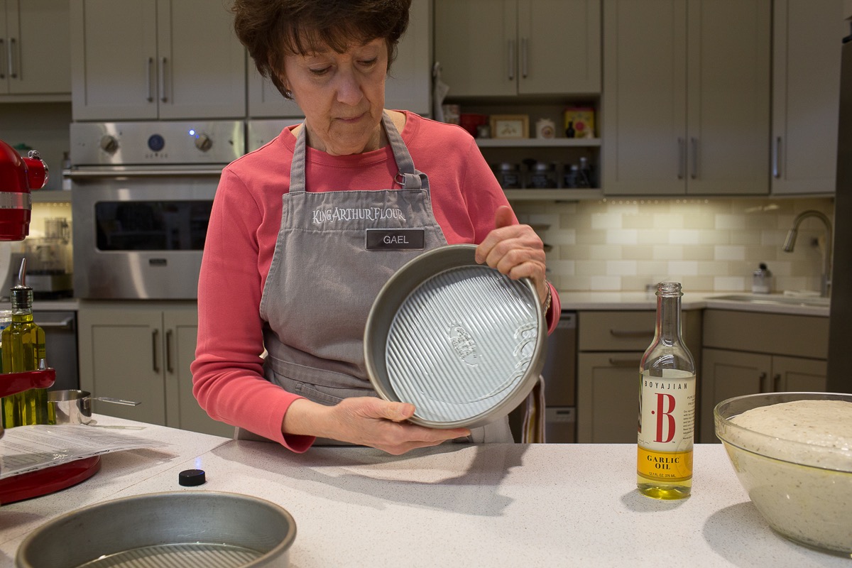 Lightly grease two 8" or 9" round cake pans, and drizzle 1 tablespoon garlic oil or olive oil into each pan, swirling it across the bottom. "The oil will insure that the bottom of the focaccia will be crispy and tasty," says Gael.