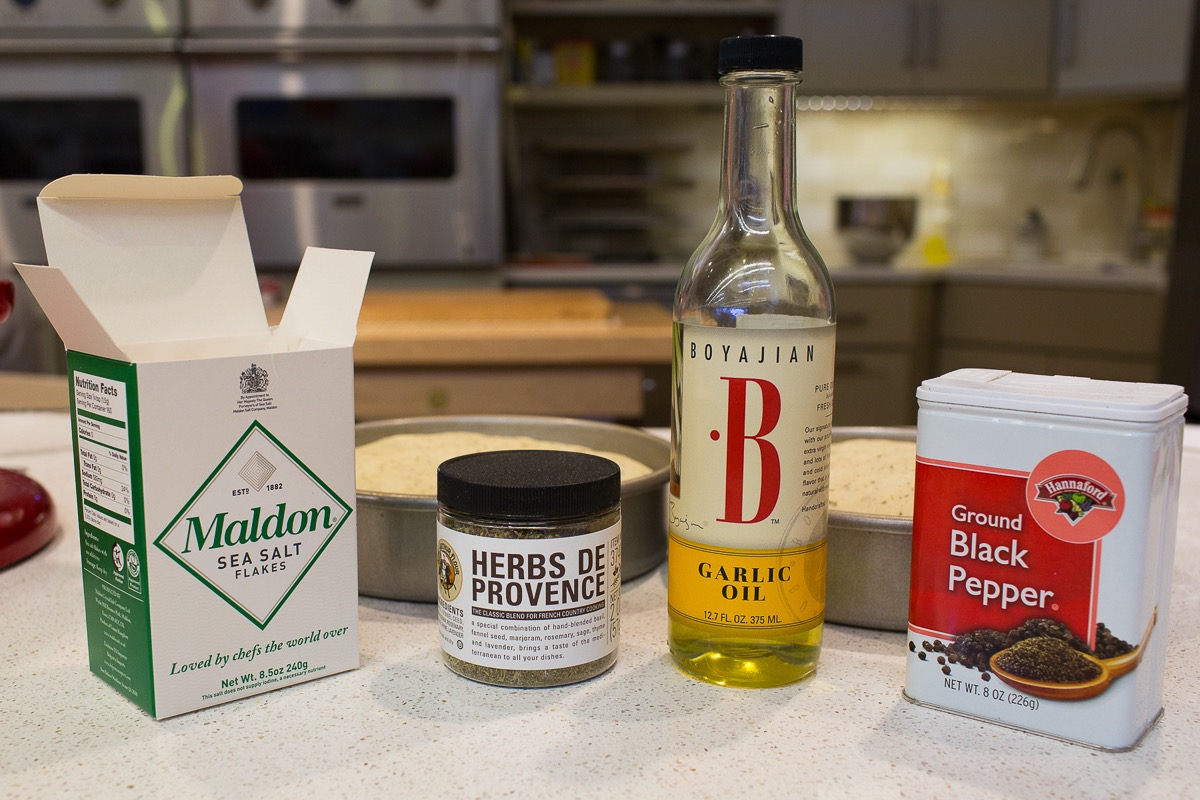 Sprinkle the top with herbes de Provence, a bit of coarse sea salt for crunch and flavor, and ground black pepper (if desired). Drizzle with garlic oil or olive oil.