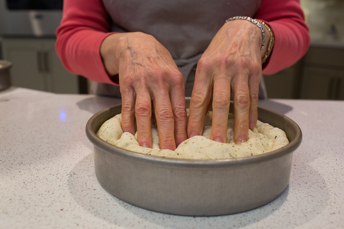 Use your fingers to gently but firmly dimple the dough, making focaccia's signature little hills and valleys.