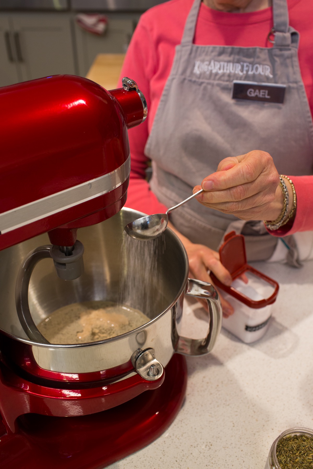 Gael notes, "I use Maldon sea salt, garlic oil, semolina, our all-purpose flour, and herbes de Provence. I tell people if you don’t have those same ingredients, your focaccia won’t turn out like mine. And if customers buy the garlic oil and herbes de provence, they get our 'Gael’s discount' at checkout!"