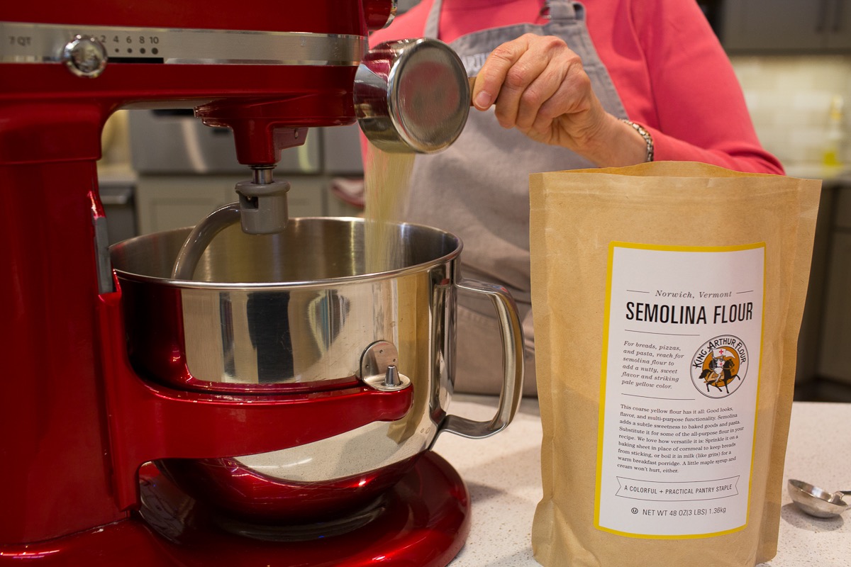 Stir in 1/2 cup (82g) semolina. This adds a bit of warm color and slight crunch, but substitute unbleached all-purpose flour if you don't have semolina.