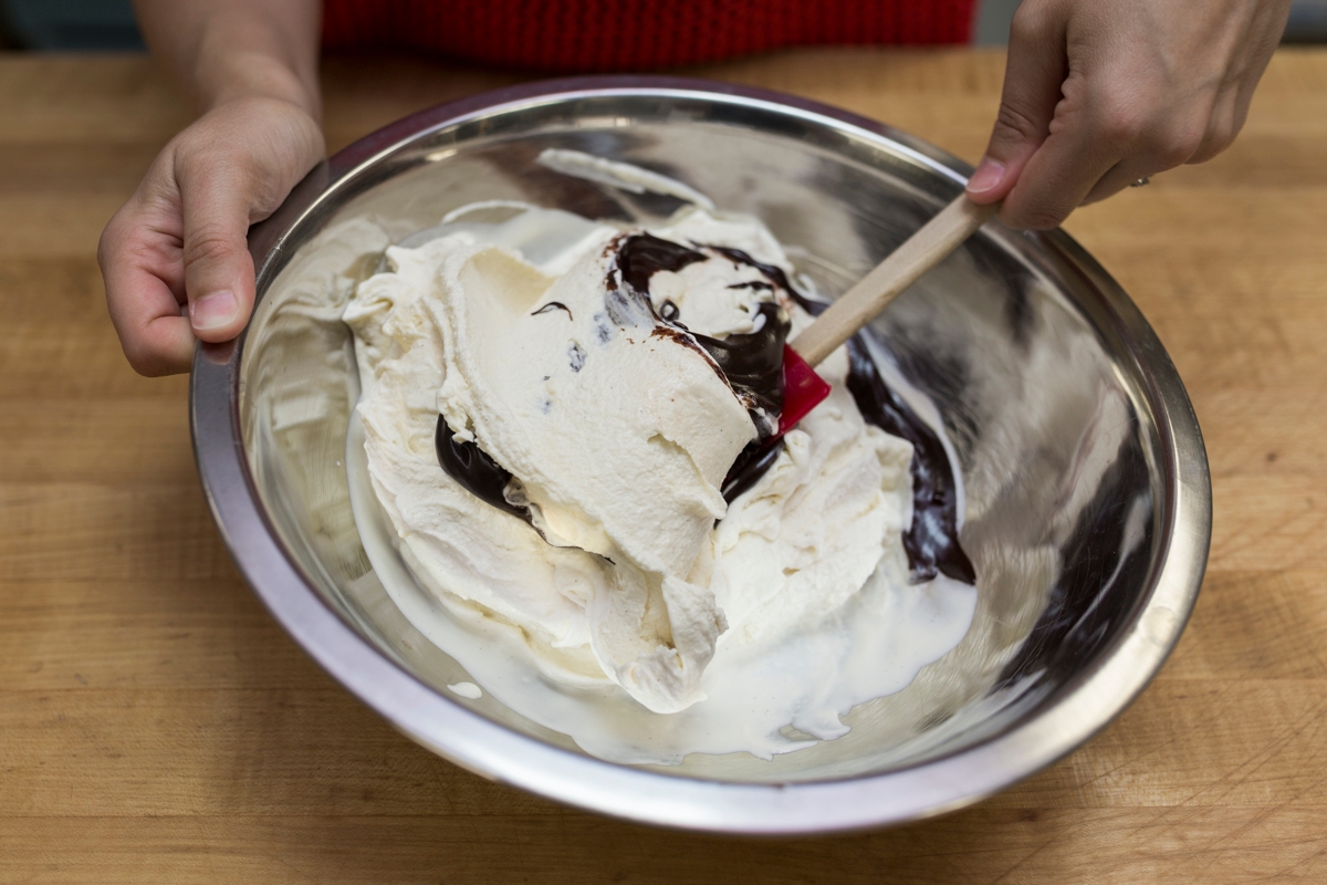 For more delicate add-ins, like fudge or caramel for a swirl, it's better to scoop the ice cream into a bowl and gently fold the sauce in with a spoon or spatula.You have a better shot of controlling how blended your swirl becomes. Adding sauce directly to the machine will run the risk of it blending in completely.