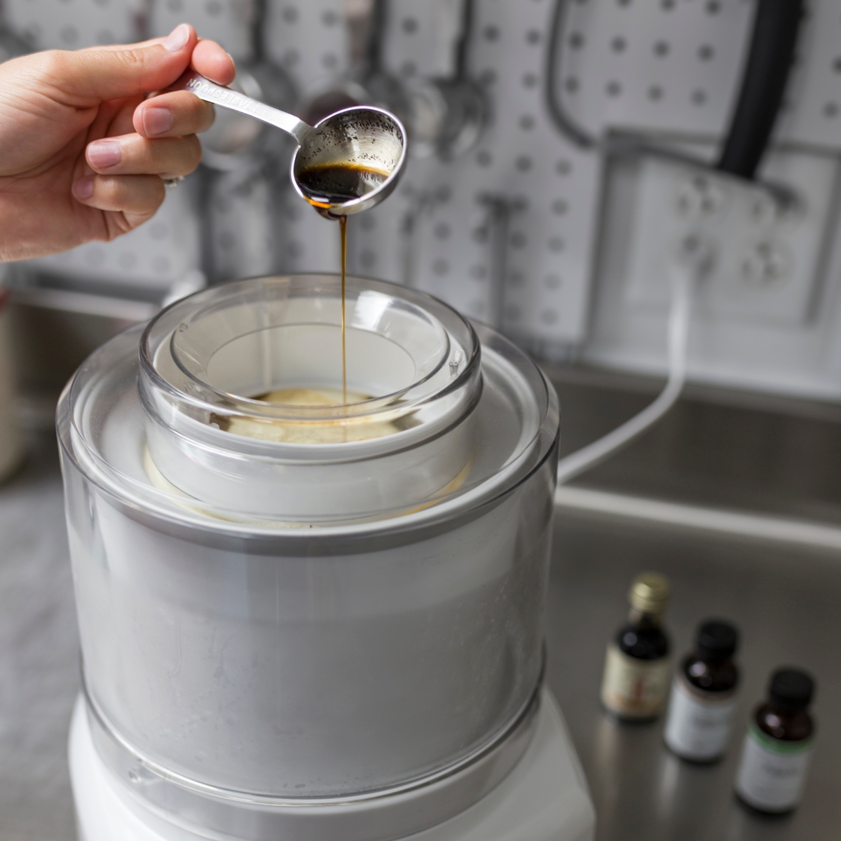 If you're adding extracts, plan to add up to 1 tablespoon more, depending on how much you like the flavor. We wanted our vanilla to POP, so we went all in. If you're using an extra-strong flavor, use a bit more discretion. Since these flavors are so super concentrated, adding no more than 1/2 teaspoon extra to your ice cream will get you where you want to go.
