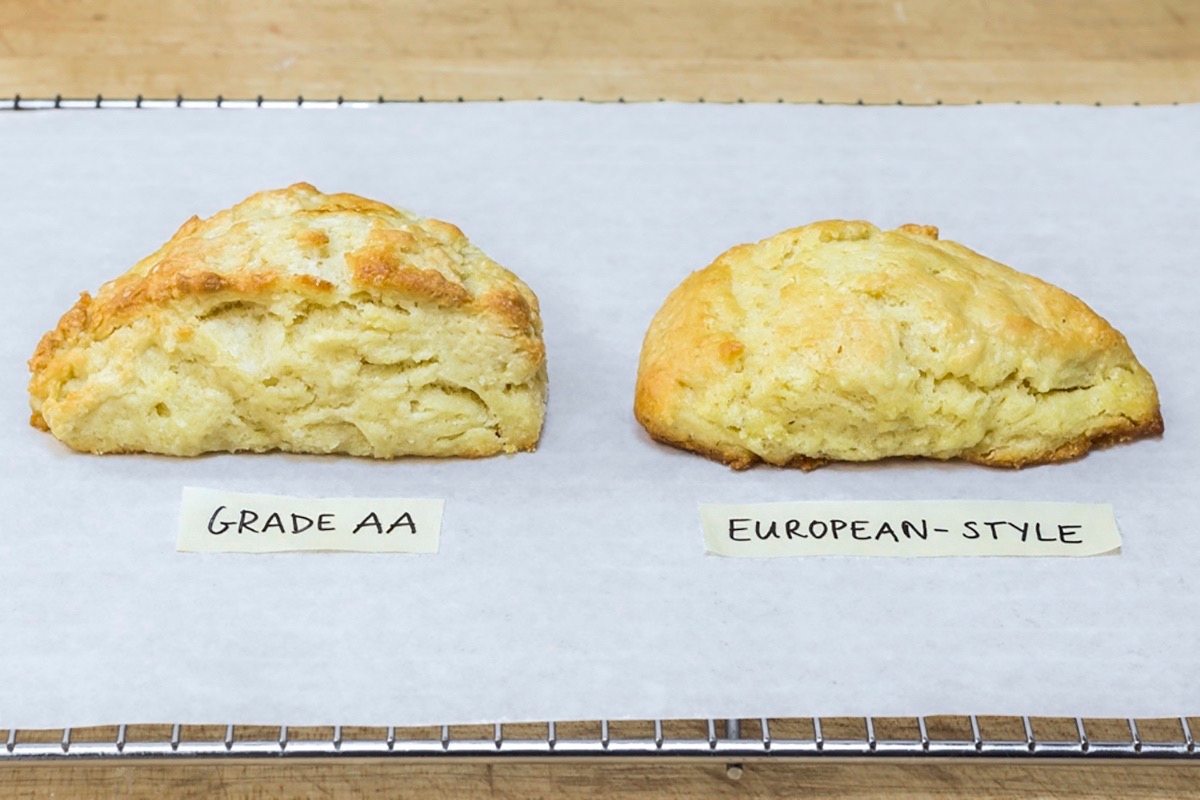 We wondered if the water content would create a visible difference in the texture of scones. To find out, we baked our scones two ways, one version with European-style butter and one with grade AA.