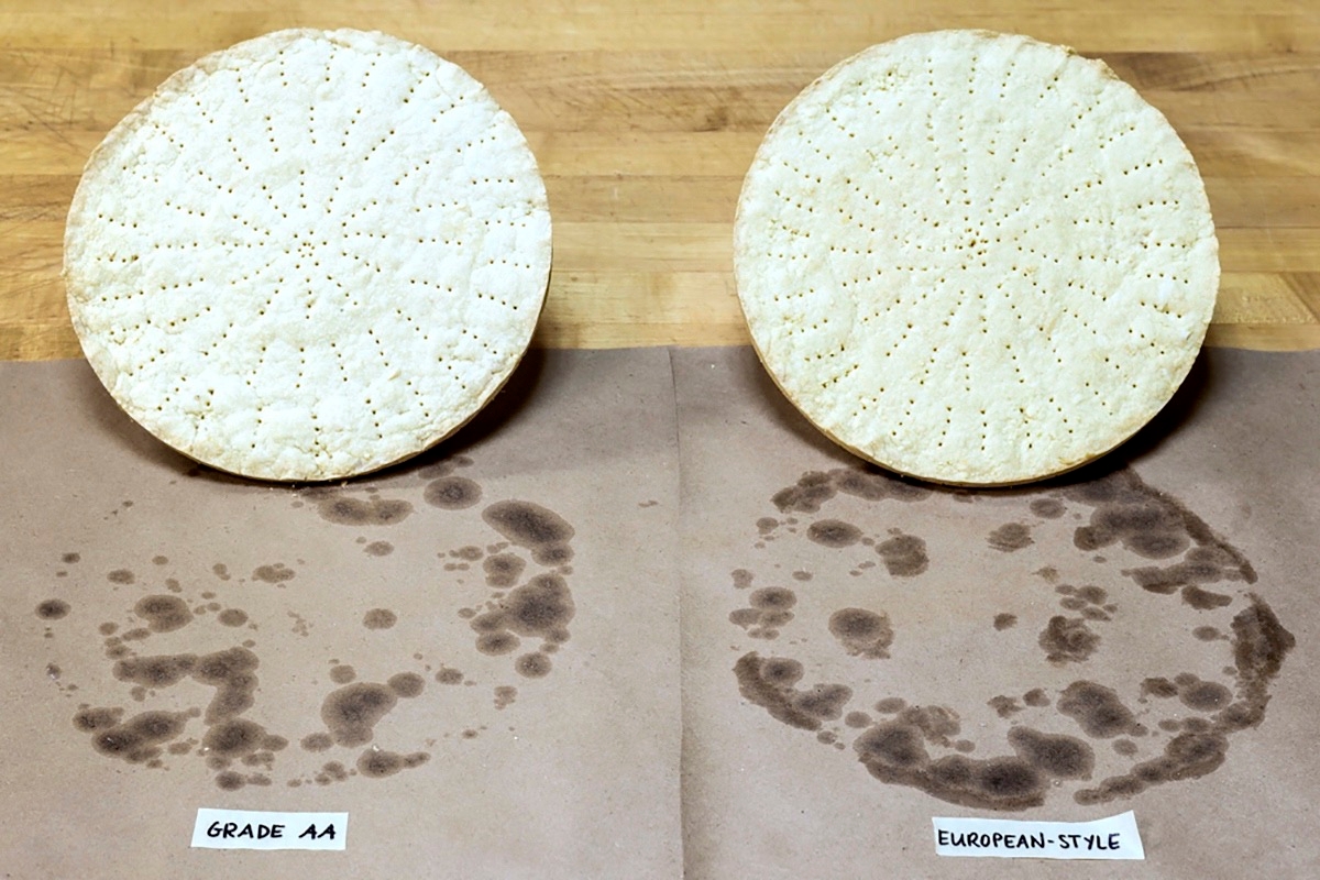 We decided to bake up two batches of our shortbread recipe using grade AA and a European-style butter to see if there was any difference in how “leaky” they were.