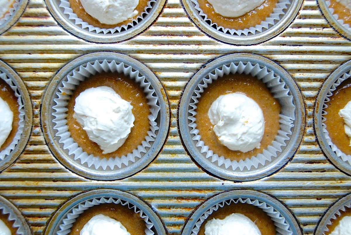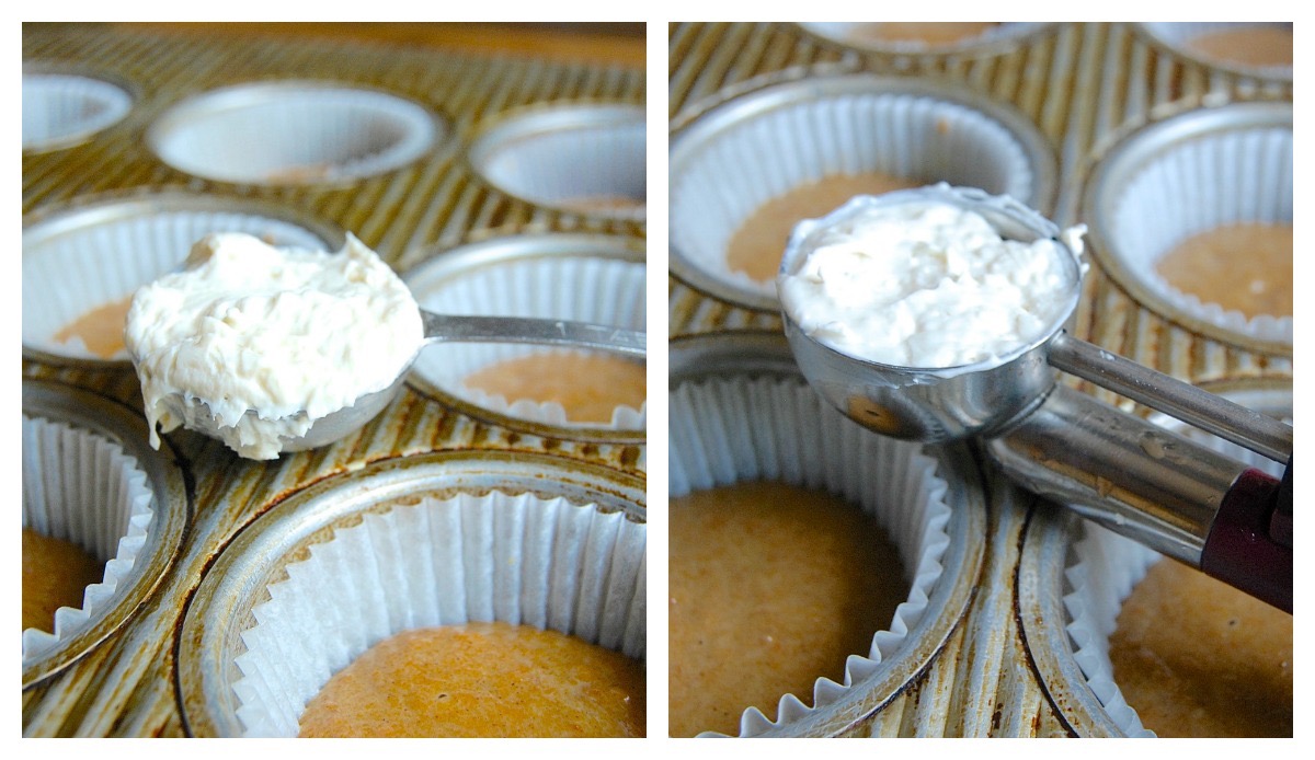 Drop a scoop of filling into the center of each muffin cup. Another cookie scoop plug: this is a LOT easier with a scoop than a tablespoon, which requires scraping out after each muffin.