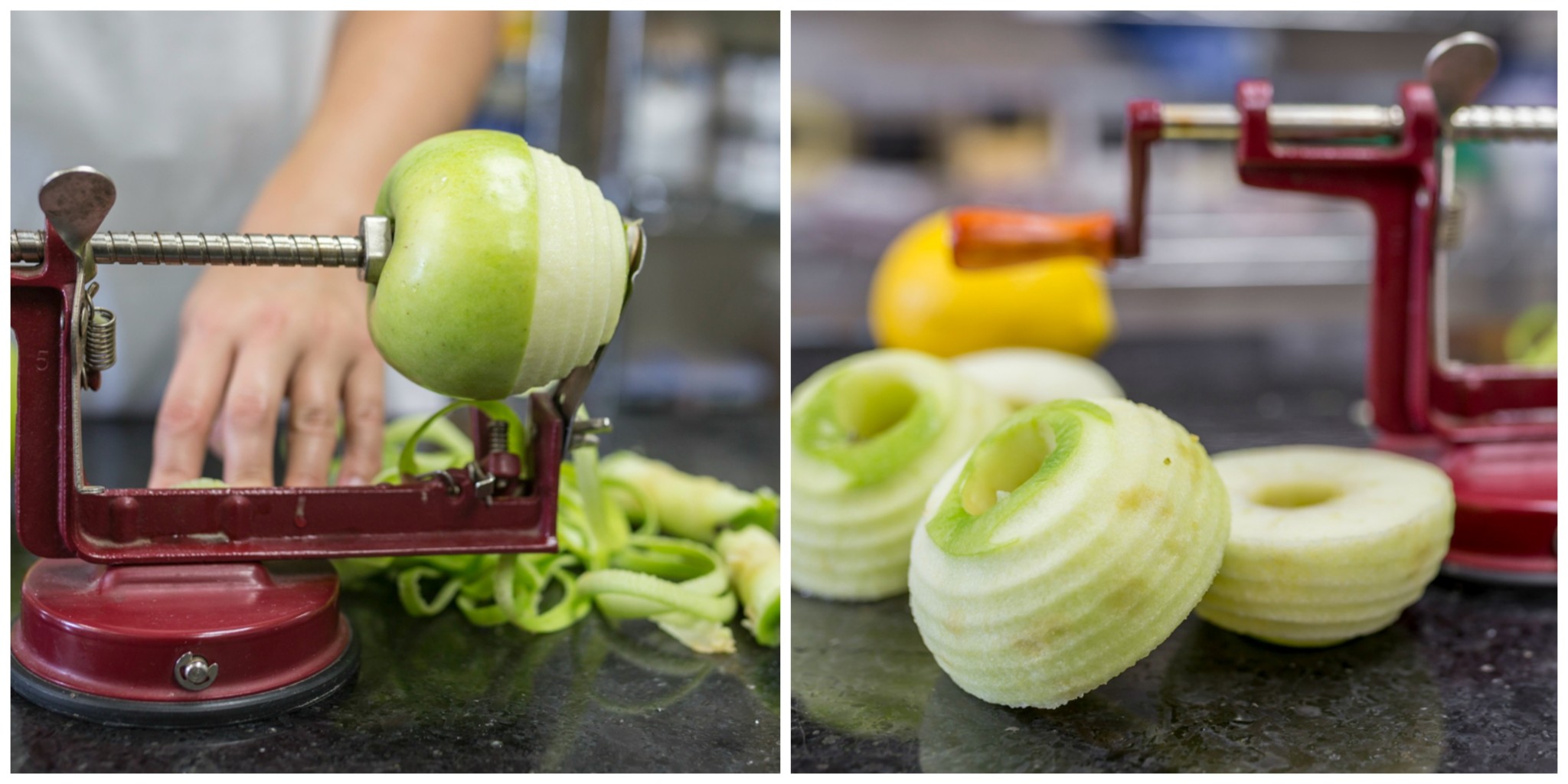 Wash, peel, and core 4 small apples, saving the peels. I find myself using an Apple Peeler, Corer, and Slicer anytime I bake with apples because it just makes it so fast and tidy. Note: if you use a peeler/corer/slicer, remember to move the slicer out of the way; you don't want these apples sliced.